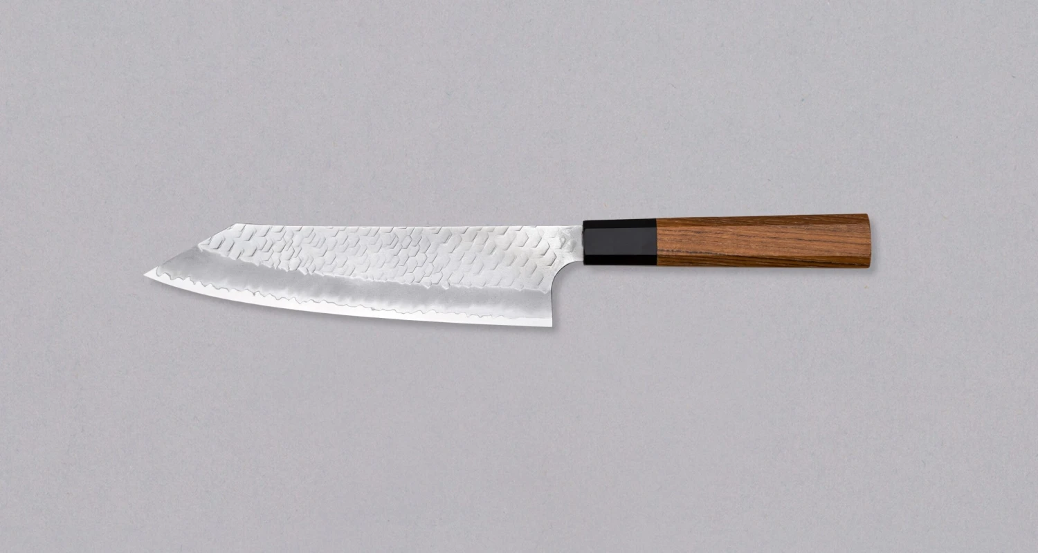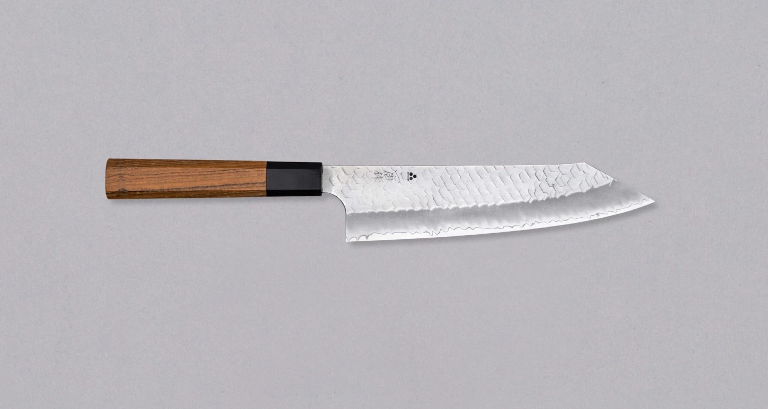 Nigara Kiritsuke-Gyuto SG2 Tsuchime Wa 210mm is a multi-purpose Japanese kitchen knife, suitable for preparing meat, fish and vegetables. The Kiritsuke-Gyuto knife possesses exceptional character and significance, setting it apart in any culinary setting. The name kiritsuke refers to the tanto tip, which is, besides looking awesome, also an homage to the katana.