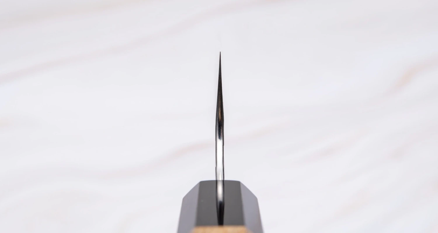 It has a double bevel (symmetrical) blade with convex (full hamaguri) grind. Hamaguri grind allows superior sharpness that requires delicate handling and helps to prevent food from sticking to the blade. Such a shape keeps a lot of metal behind the edge and makes for a stronger edge, yet it still allows a good degree of sharpness. The downside to a convex grind is that it is very hard to reproduce by anyone other than a very experienced sharpener.
