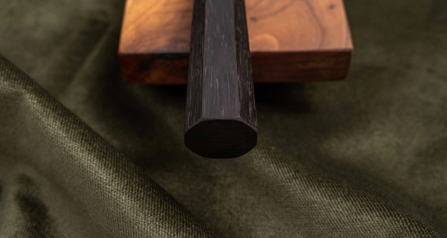 The Japanese handle (Wa) is crafted from a single piece of dark ebony wood without the additional ferrule. The handle is suitable for both left and right-handed users and embodies a simple Japanese aesthetic. Ebony wood is the ideal choice for Japanese handles due to its hardness, durability, and aesthetic appearance. Its rich color, visible grain patterns, and historical significance further enhance the wood’s desirability and appeal.
