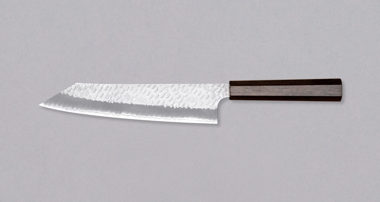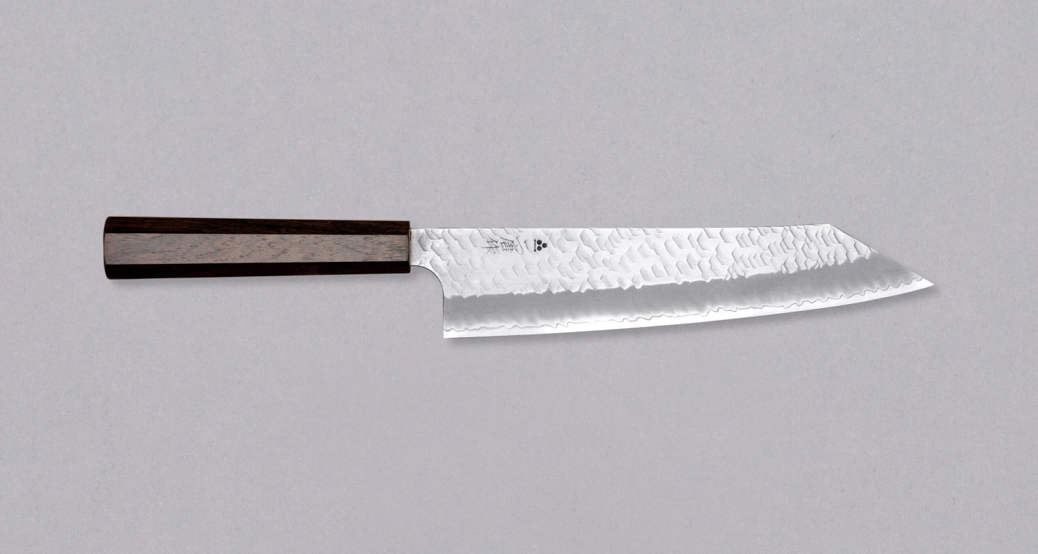 Nigara Kiritsuke-Gyuto SG2 Tsuchime Wa Ebony 240mm is a multi-purpose Japanese kitchen knife, suitable for preparing meat, fish and vegetables. The Kiritsuke-Gyuto knife possesses exceptional character and significance, setting it apart in any culinary setting. The name kiritsuke refers to the tanto tip, which is, besides looking awesome, also an homage to the katana.