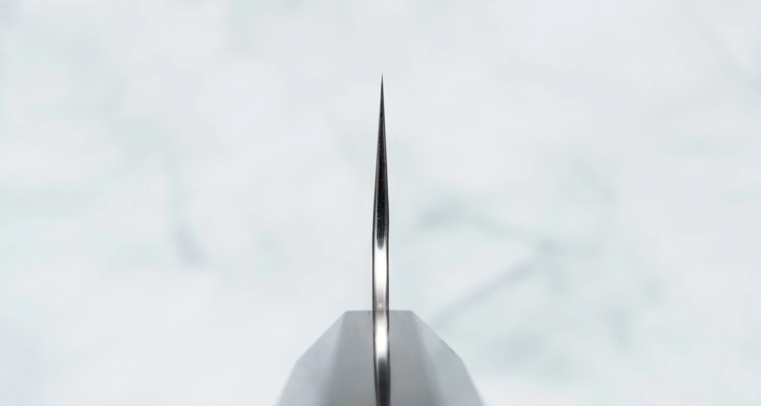 It has a double bevel (symmetrical) blade with convex (full hamaguri) grind. Hamaguri grind allows superior sharpness that requires delicate handling and helps to prevent food from sticking to the blade. Such a shape keeps a lot of metal behind the edge and makes for a stronger edge, yet it still allows a good degree of sharpness. The downside to a convex grind is that it is very hard to reproduce by anyone other than a very experienced sharpener.