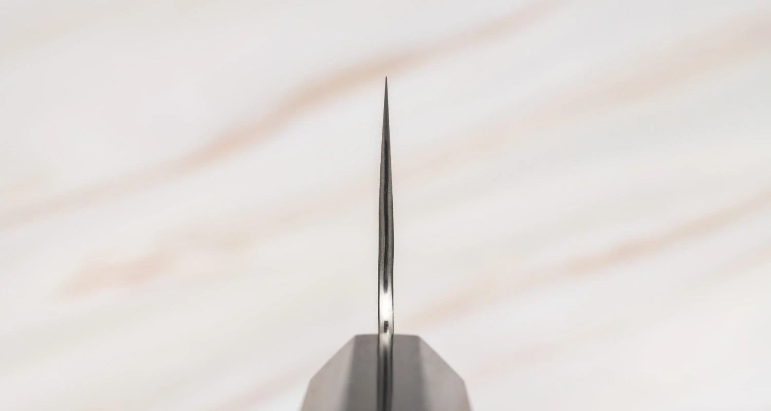It has a double bevel (symmetrical) blade so it is suitable for both left- and right-handed users. Based on the ratio between the surfaces (the location of the angle change), this knife’s profile is classified as a flat V-edge type, which makes it less brittle and easier to resharpen.