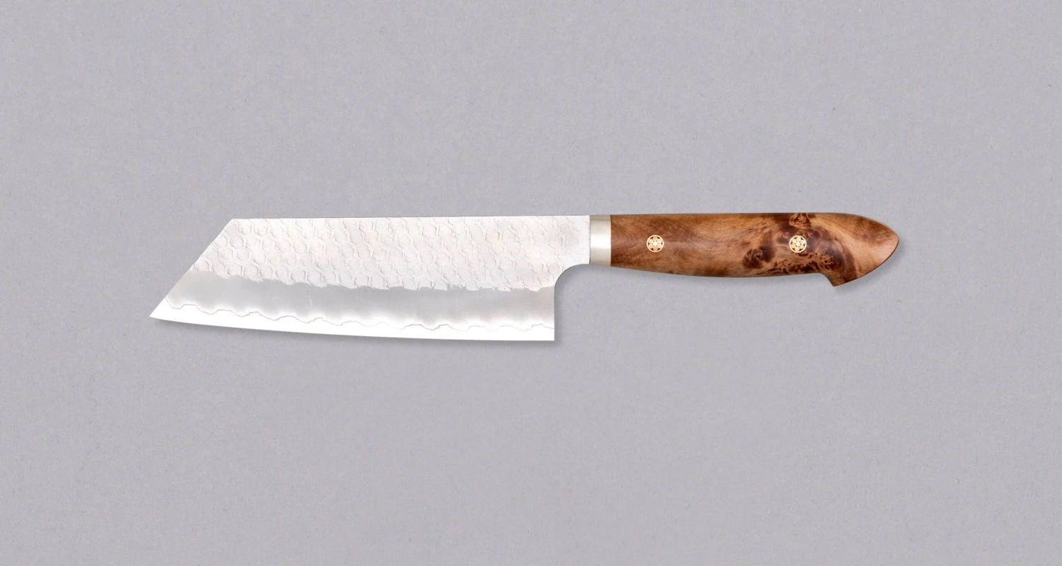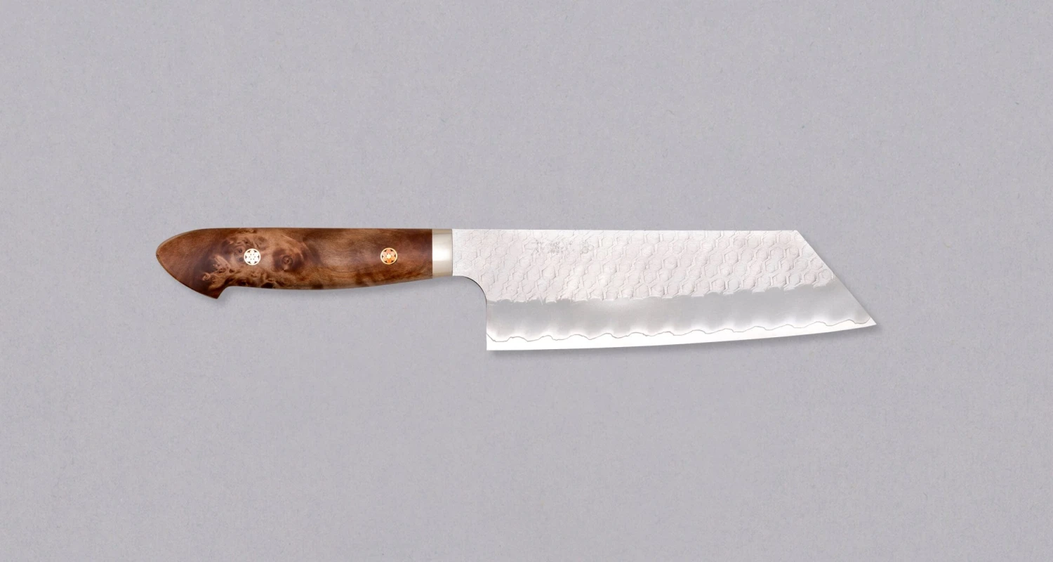 Introducing the Nigara Kiritsuke Nakiri SG2 Tsuchime Maplewood 180mm knife—a true embodiment of a traditional Japanese vegetable chopping knife. With its kiritsuke tip, it offers enhanced precision and versatility in the kitchen. Thanks to the SG2 powder steel core and hamaguri profile, you can count on this knife to maintain long-lasting sharpness with minimal upkeep. It’s a high-quality knife that’s designed to excel and endure in your culinary endeavors.