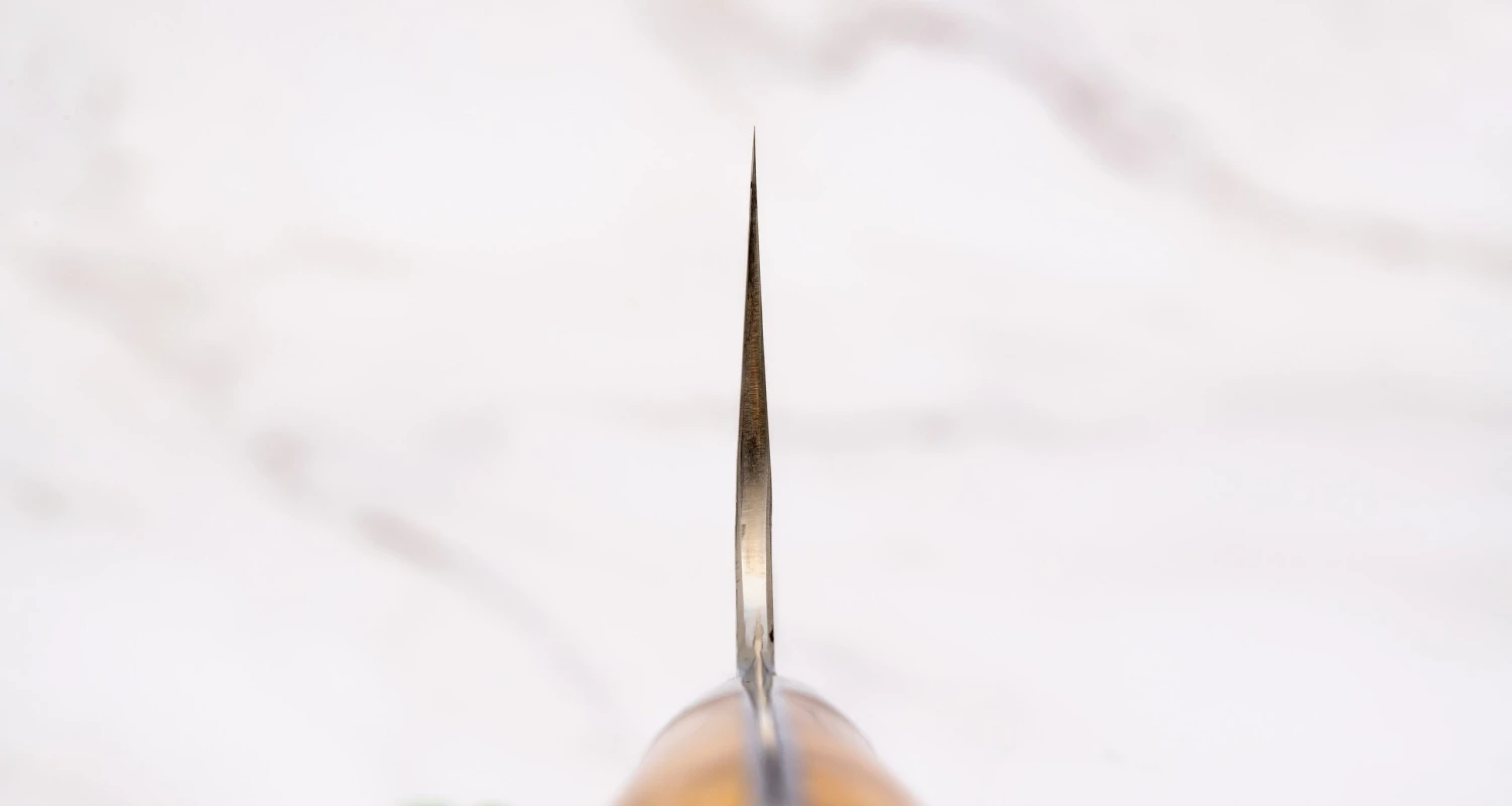 The knife is characterized by a special tip called the reverse tanto or kiritsuke tip (“K-tip” for short). The profile of the spine slopes down sharply towards the end of the blade, making the knife thin and narrow at the tip. The thin tip is excellent for trimming and chopping paper-thin pieces of garlic, shallots, radishes, etc.