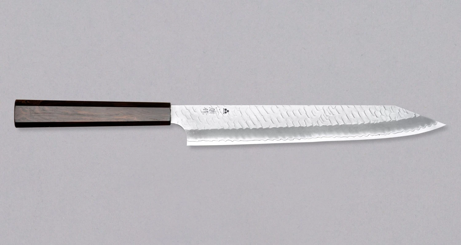 Nigara Kiritsuke-Sujihiki SG2 Tsuchime Wa Ebony 255mm is a traditional Japanese knife used for preparing meat and raw fish. Its length allows the user to slice different types of protein in one single pulling motion, which will – together with the razor-sharp double bevel blade – birth smooth, shiny cuts. The name kiritsuke refers to the tanto tip, which is, besides looking awesome, also an homage to the katana.