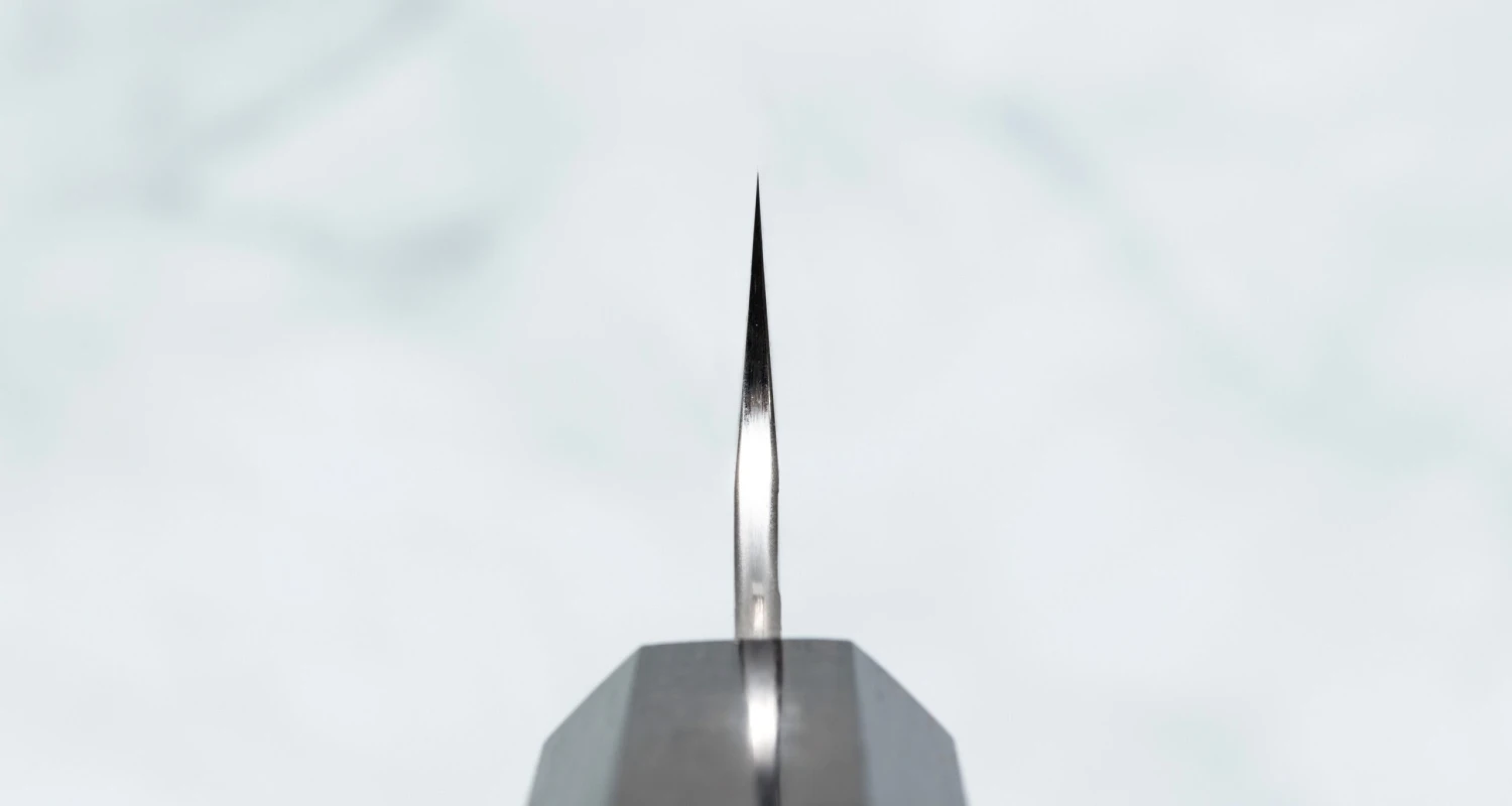 It has a double bevel (symmetrical) blade with convex (full hamaguri) grind. Hamaguri grind allows superior sharpness that requires delicate handling and helps to prevent food from sticking to the blade. Such a shape keeps a lot of metal behind the edge and makes for a stronger edge, yet it still allows a good degree of sharpness. The downside to a convex grind is that it is very hard to reproduce by anyone other than a very experienced sharpener.