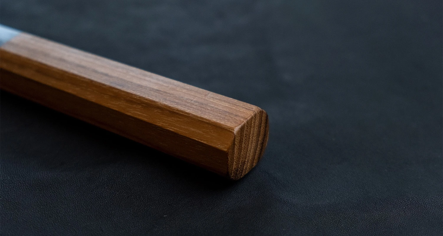 The traditional Japanese (Wa) style handle is octagonal in shape and is made of teak wood with a water buffalo horn ferrule. The symmetrical handle embodies the minimalistic Japanese aesthetic.
