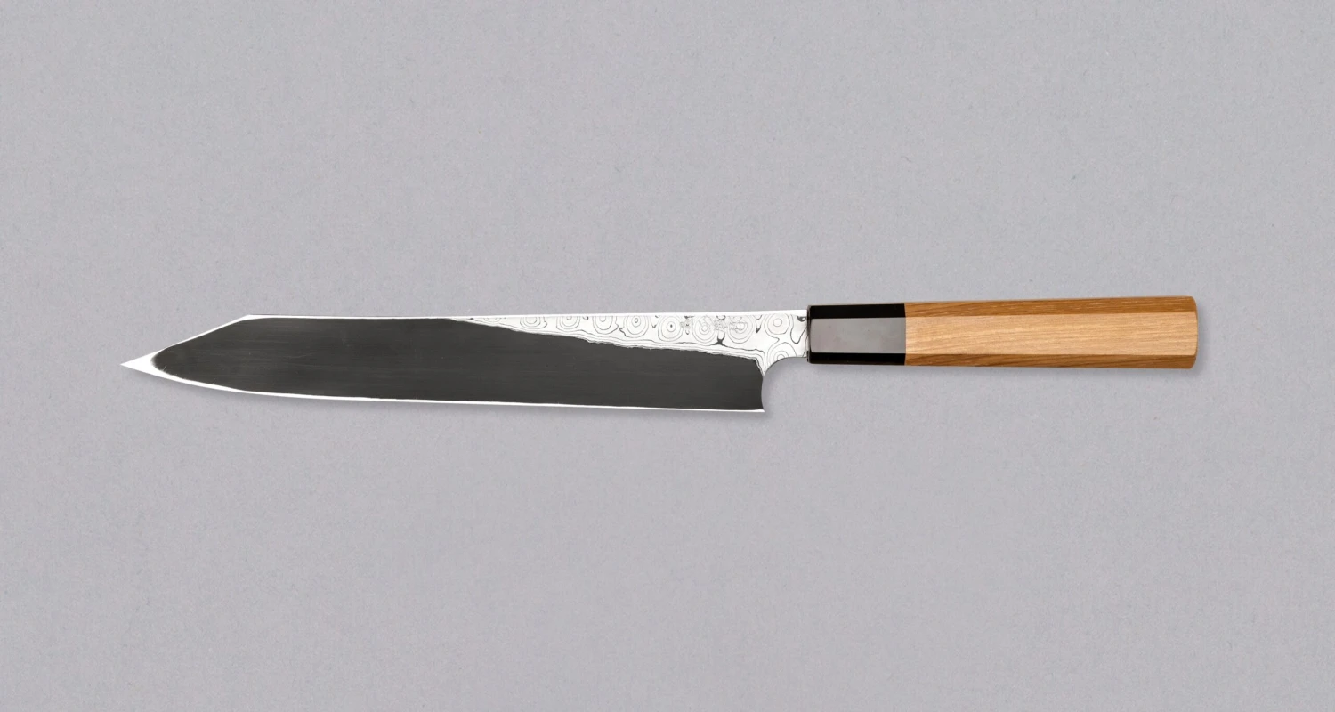 Yanagiba (literally ‘willow’, as its shape is reminiscent of a willow leaf) is one of the three traditional Japanese knives (besides deba and usuba), and it’s used for slicing raw fish. They have a single bevel, which can achieve a much finer sharpness – this is key if you want the cut to be as clean and smooth as possible. Yanagiba knives are usually 240-360 mm long, which allows the user to slice the sashimi in a single pulling motion to prevent any shredded, zigzag cuts that would result in damaged food tissue.