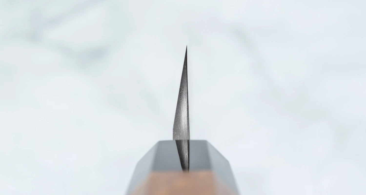 It has a single bevel (asymmetrical) blade and has a chisel bevel grind As such, the blade and handle are not suited for left-handed people but right-handed users only. The profile of the blade is superb with a deep ground urasuki and a very fine secondary angle. The profile of the blade and the gradual tapering of it are crafted to perfection. Single bevel blades make extremely precise cuts and are easy to resharpen.