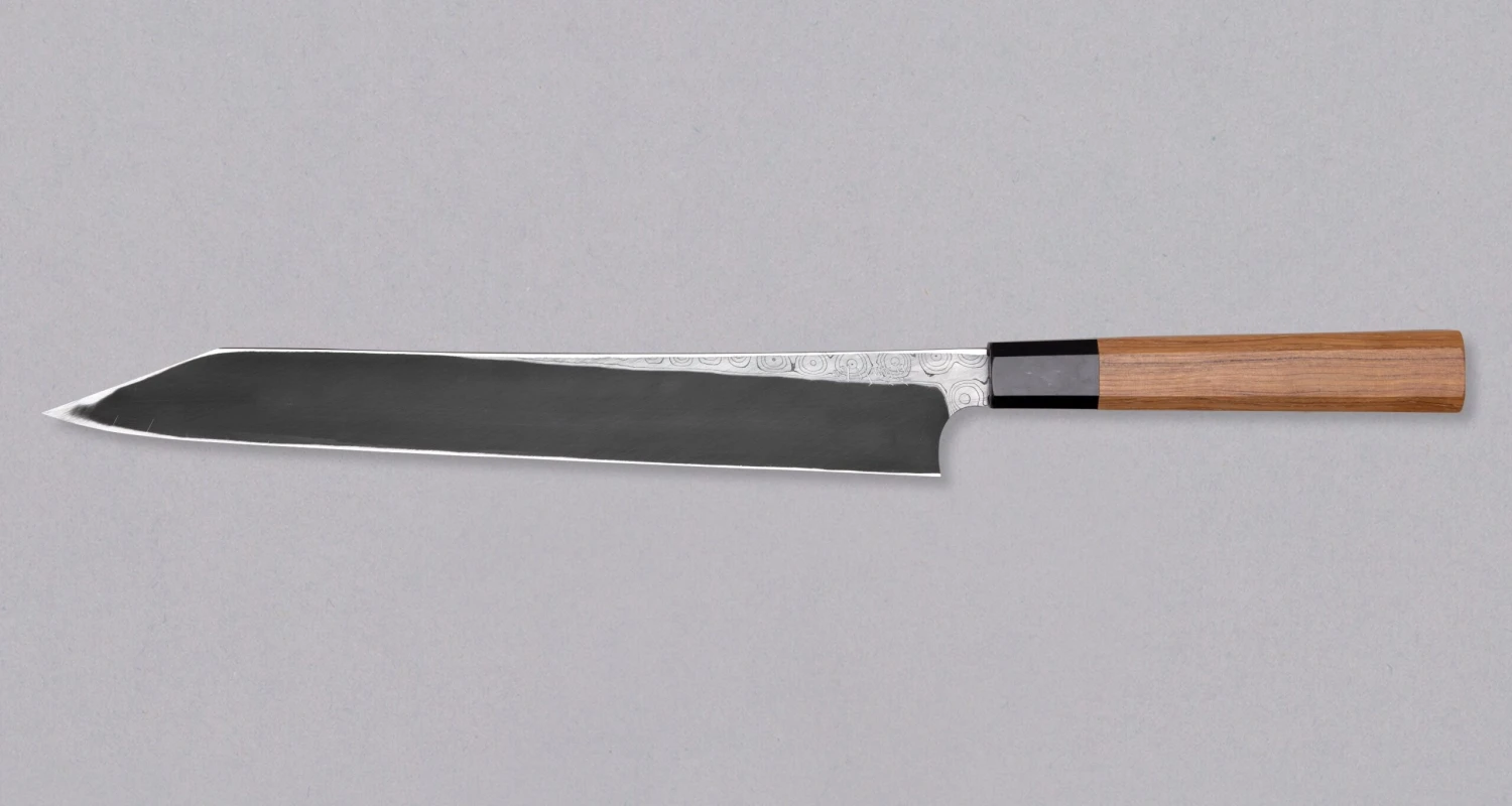 Nigara Kurozome Kiritsuke Yanagiba Aogami #2 Damascus 300mm (11.8″) is a traditional single-bevel Japanese knife used for preparing fish, especially sashimi and nigiri sushi. Its length allows the user to slice different types of protein in one single pulling motion, which will – together with the razor-sharp single bevel blade – birth smooth, shiny cuts.