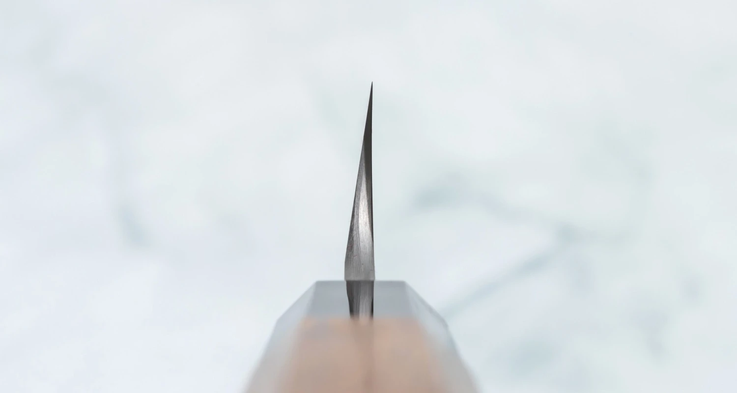 It has a single bevel (asymmetrical) blade and has a chisel bevel grind As such, the blade and handle are not suited for left-handed people but right-handed users only. The profile of the blade is superb with a deep ground urasuki and a very fine secondary angle. The profile of the blade and the gradual tapering of it are crafted to perfection. Single bevel blades make extremely precise cuts and are easy to resharpen.