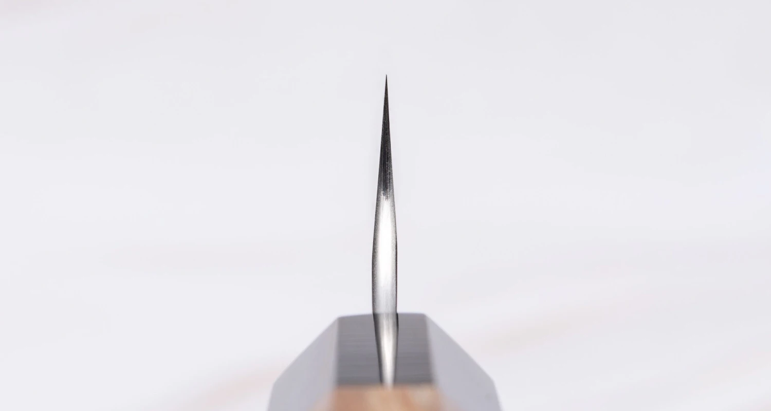 It has a double bevel (symmetrical) blade with convex (full hamaguri) grind. Hamaguri grind allows superior sharpness that requires delicate handling and helps to prevent food from sticking to the blade. Such a shape keeps a lot of metal behind the edge and makes for a stronger edge, yet it still allows a good degree of sharpness. The downside to a convex grind is that it is very hard to reproduce by anyone other than a very experienced sharpener.