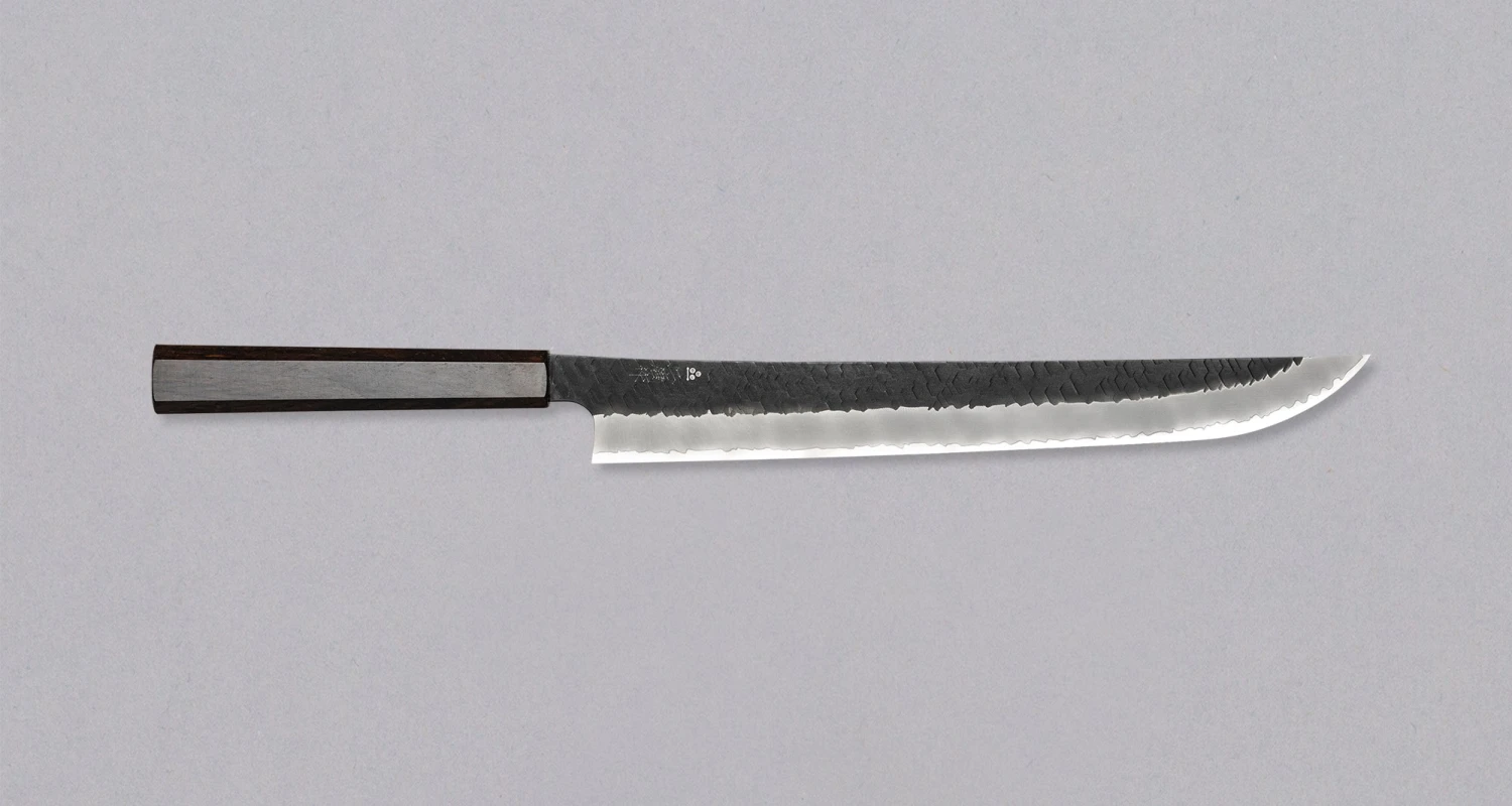 The long blade allows the meat or fish to be cut in a single drawing motion, from heel to tip, while the tip can be utilized for intricate, precise work. The belly of the blade is curved, which differentiates it from a standard, flatter yanagiba or slicer shape. The length and the shape of the blade allows the user to slice the meat and fish in a single pulling motion to prevent any shredded, zigzag cuts that would result in damaged food tissue.
