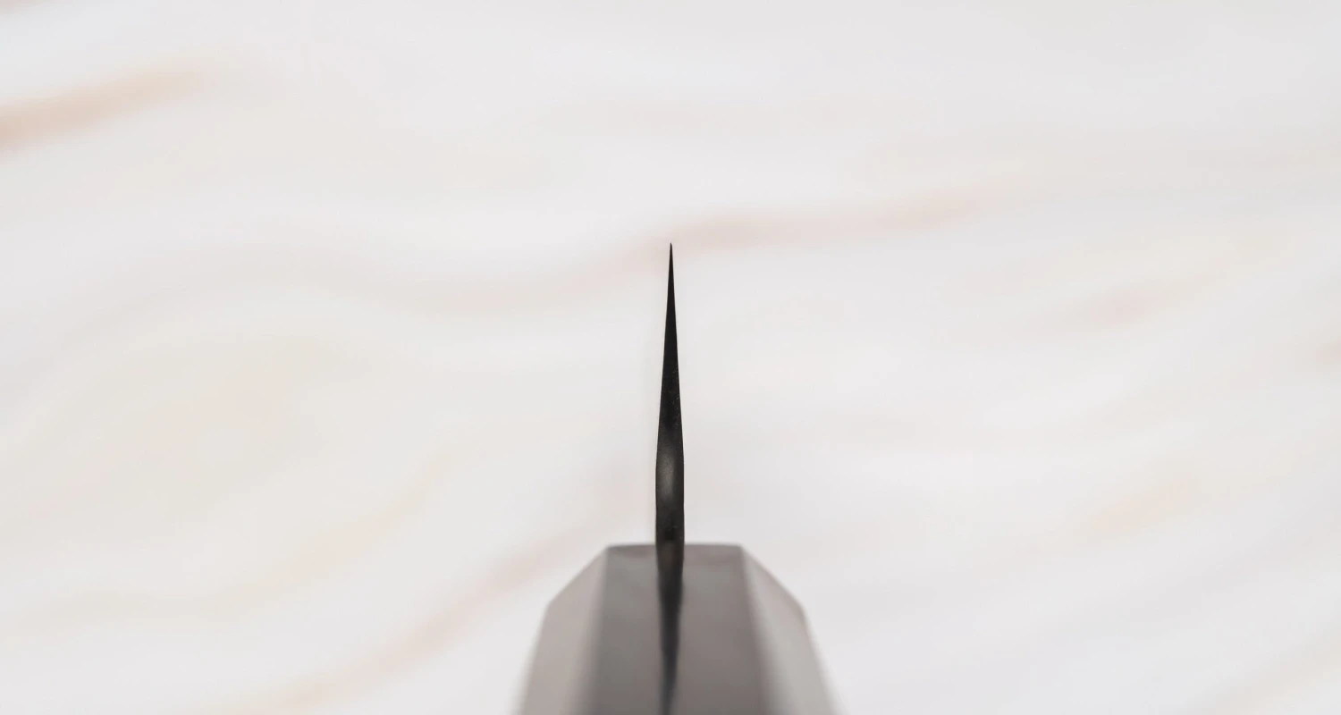 It has a double bevel (symmetrical) blade with concave (hollow) grind. Hollow grinds finish in a very thin and extremely sharp point, the thinnest among double bevel knives. The blade remains sharp for a very long time despite frequent sharpening. This thin profile gives the impression that a knife is sharp even though it’s already ripe for sharpening. Such geometry helps prevent food from sticking to the blade.