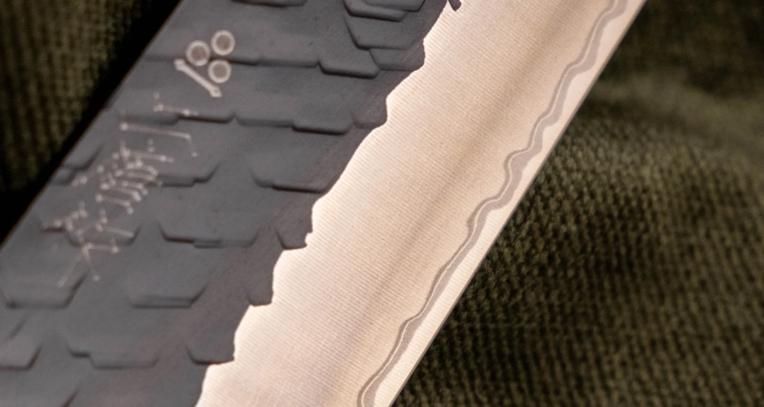 The surface of the blade is a fascinating mix of tsuchime and kurouchi. The raw rustic dark kurouchi was finished with a specially textured hammer that leaves complex geometric impressions on the top – this blade finish is called tsuchime. The tsuchime surface reduces friction and prevents food from sticking to the blade while cutting, as the textured surface creates small air pockets that allow for smoother and more precise cutting.