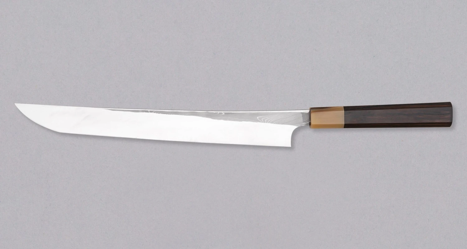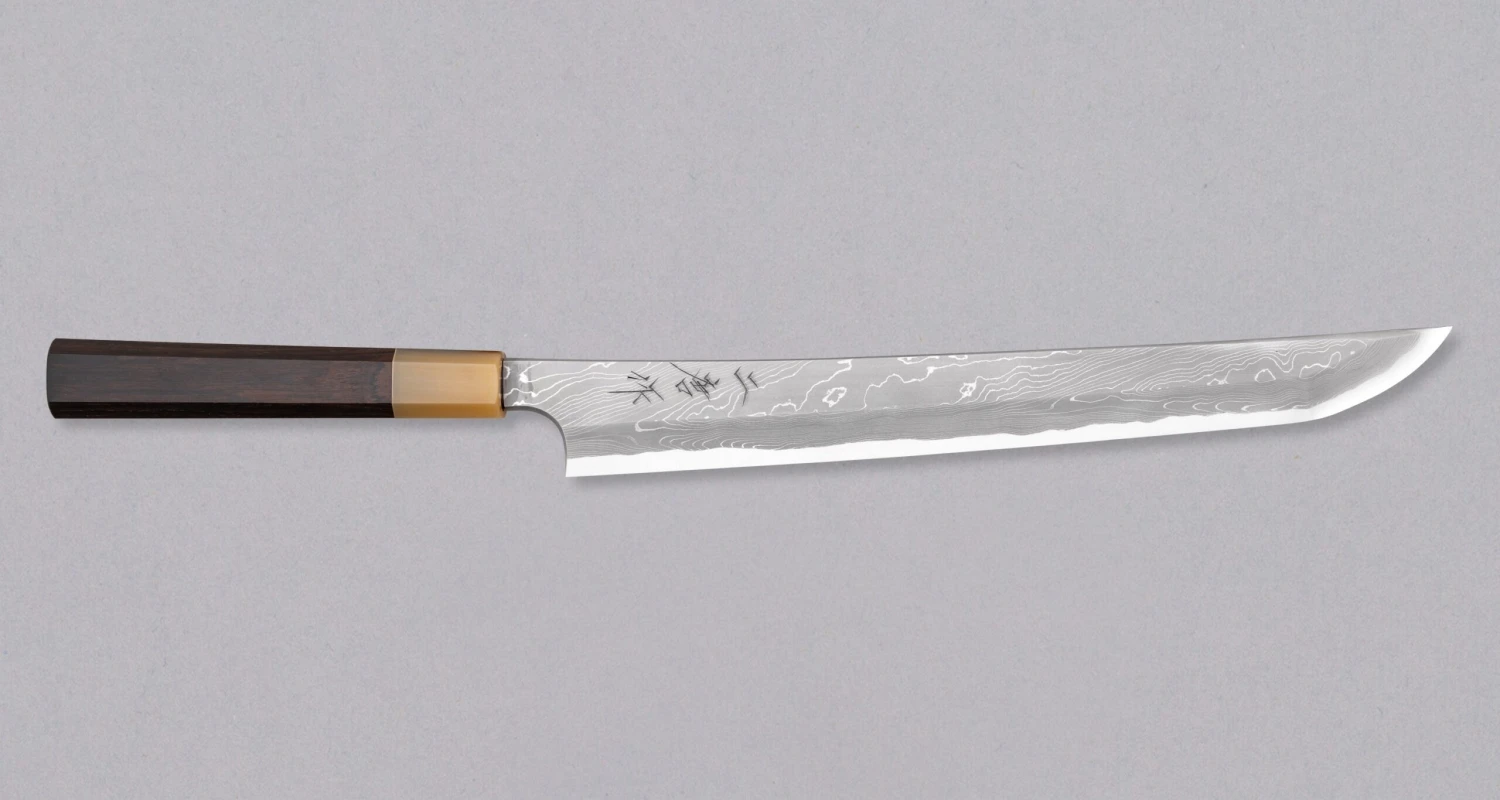One of the most impressive collector’s pieces we have on offer. This spectacular sakimaru yanagiba by the famous Nigara Hamono smithy is a fusion of excellent performance and outstanding aesthetics rarely matched in the world of knives.