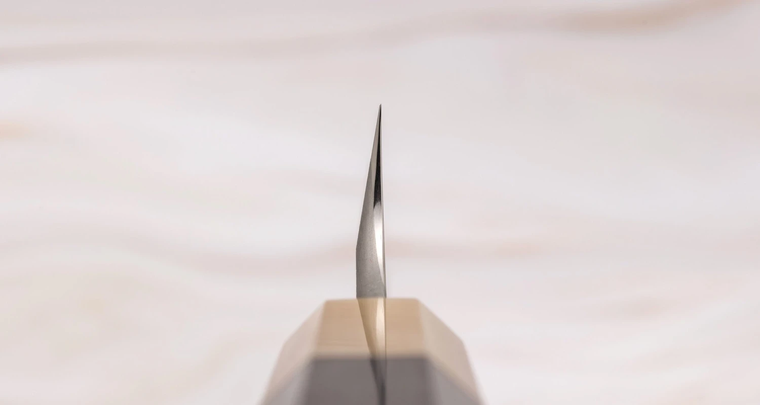 It has a single bevel (asymmetrical) blade. As such, the blade and handle are not suited for left-handed people but right-handed users only. Single bevel blades make extremely precise cuts. The back side of the blade is flat with a slightly concave lower part, while the sharp side tapers in a straight line to the edge. Traditional Japanese single bevel knives are knives with a bevel on the front – shinogi – side and a concave back – uraoshi – side. Uraoshi is the thin, flat rim that surrounds the urasuki which serves to optimize performance and enhance strength of the blade. The urasuki grind can be resharpened very quickly and easily, reduces the effect of food sticking to the blade and lends itself well to certain cutting techniques (e.g., katsuramuki or art of peeling a white radish (daikon).