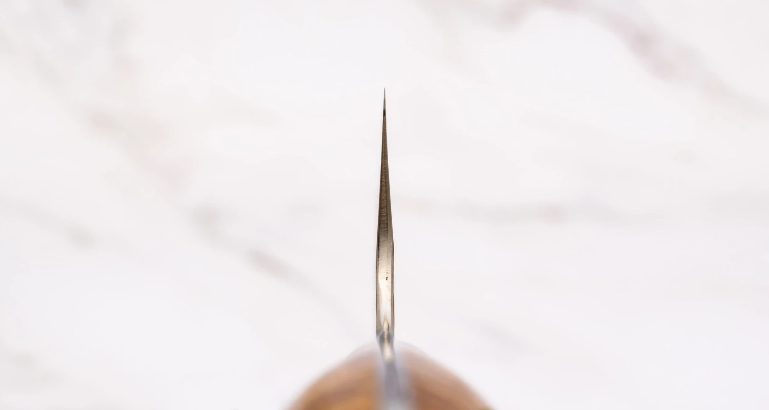 It has a double bevel (symmetrical) blade with convex (full hamaguri) grind. Hamaguri grind allows superior sharpness that requires delicate handling and helps to prevent food from sticking to the blade. Such a shape keeps a lot of metal behind the edge and makes for a stronger edge, yet it still allows a good degree of sharpness. The downside to a convex grind is that it is very hard to reproduce by anyone other than a very experienced sharpener.