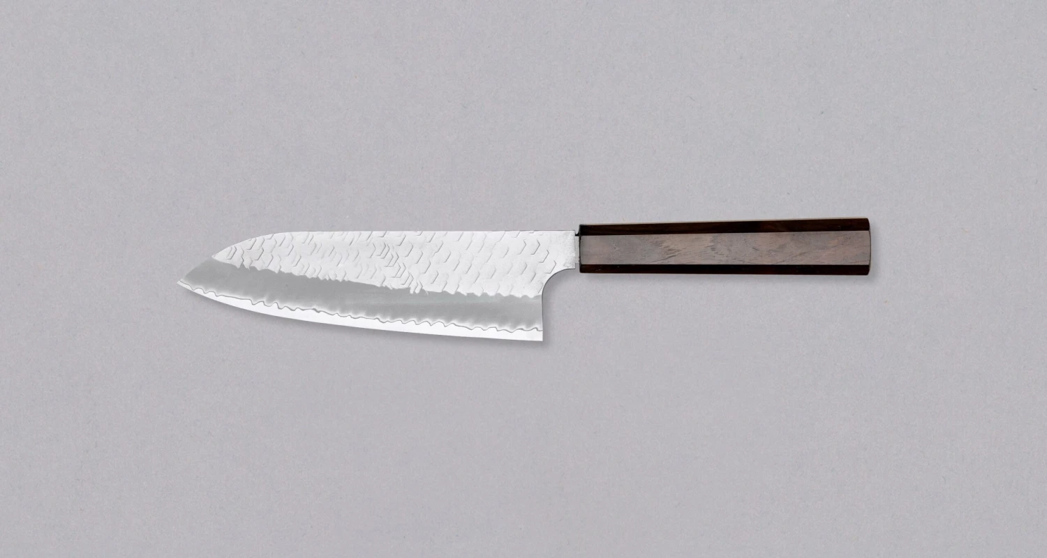The knife has all the features of a traditional Japanese santoku blade: a wide blade, a flat belly, and a spine that curves at a 60-degree angle towards the tip. The geometry of the blade (hollow grind), combined with the unique hexagonal hammer blows, prevents ingredients from sticking to the blade during chopping, making for faster and more precise work.