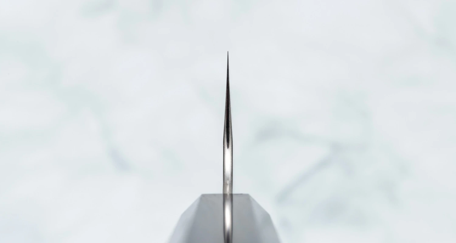 It has a double bevel (symmetrical) blade with convex (full hamaguri) grind. Hamaguri grind allows superior sharpness that requires delicate handling and helps to prevent food from sticking to the blade. Such a shape keeps a lot of metal behind the edge and makes for a stronger edge, yet it still allows a good degree of sharpness. The downside to a convex grind is that it is very hard to reproduce by anyone other than a very experienced sharpener.