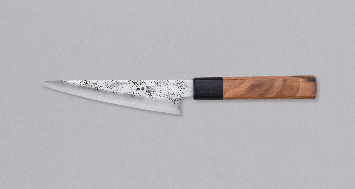 The 150mm (5.9″) blade also sports the so-called nashiji finish (see article Blade Construction: Blade Finish for more), a specific type of hammered finish, which adds to the visual appeal of the knife and prevents the food from sticking to the surface as much.