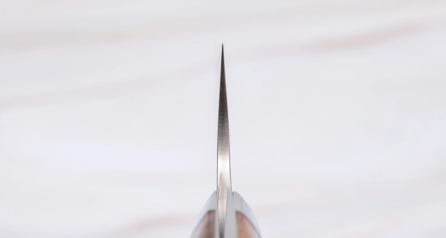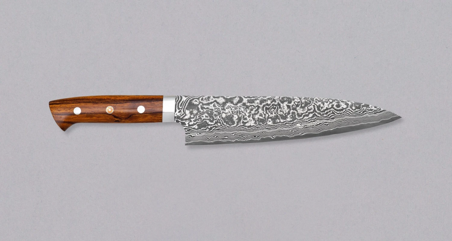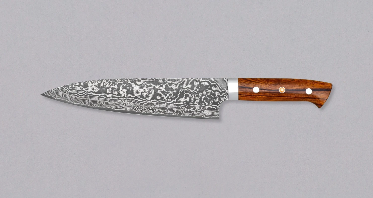 Gyuto is the most versatile and useful blade shape in the modern kitchen. It has a wide profile for easy food transfer and tends to be fairly flat towards the heel, enabling easy and fast chopping on the cutting board. A pointed tip allows piercing and precise, delicate work. A slight curve between the tip and the midsection makes the belly great for rocking the blade back and forth when cutting. It can be used for cutting meat, fish and vegetables.