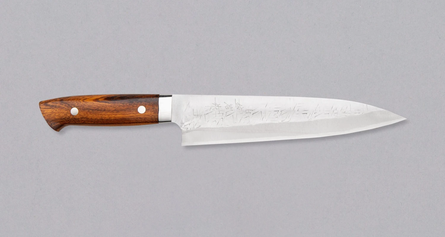 Gyuto is the most versatile and useful blade shape in the modern kitchen. It has a wide profile for easy food transfer and tends to be fairly flat towards the heel, enabling easy and fast chopping on the cutting board. A pointed tip allows piercing and precise, delicate work. A slight curve between the tip and the midsection makes the belly great for rocking the blade back and forth when cutting. It can be used for cutting meat, fish, and vegetables.