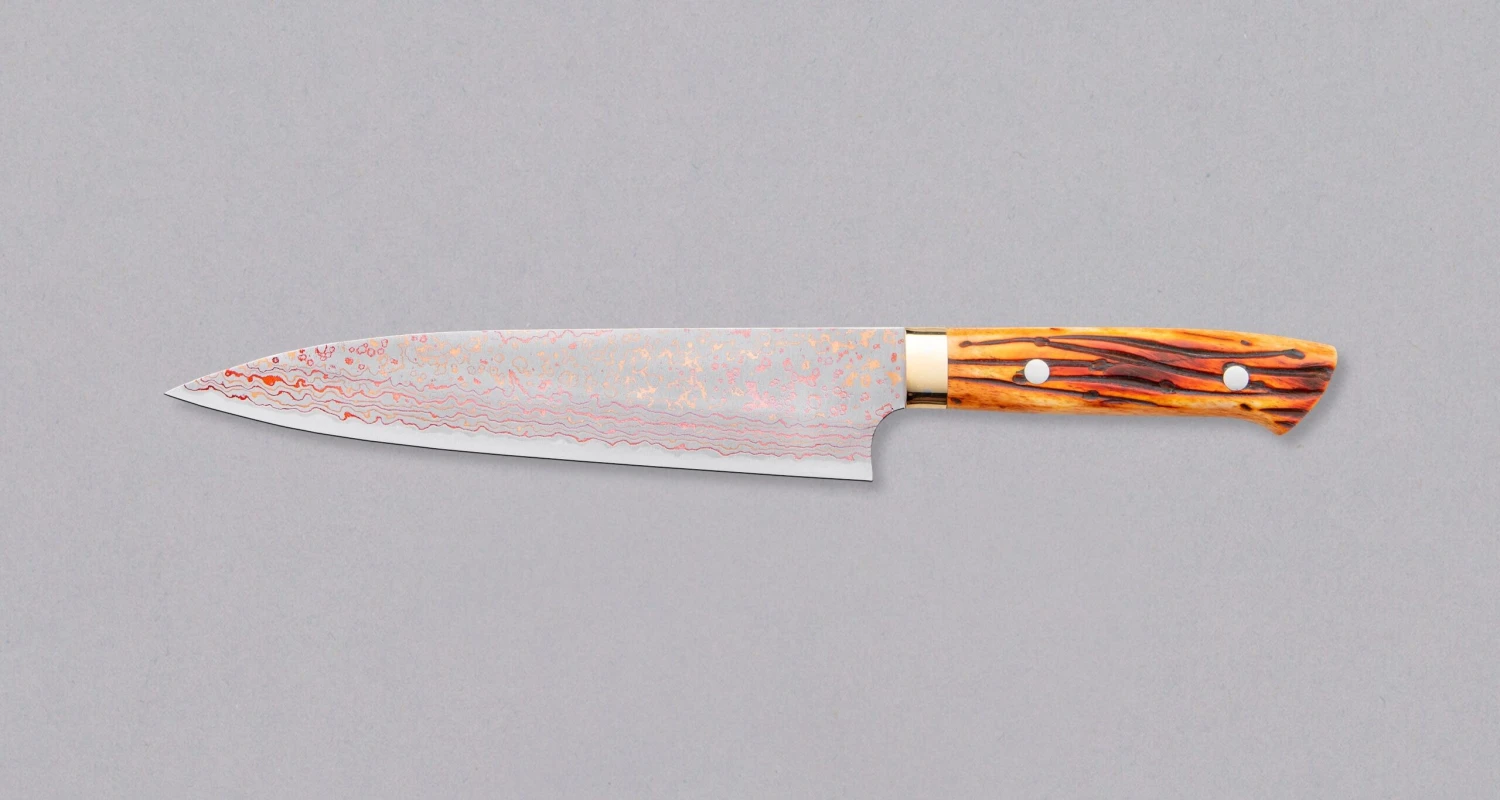 Master Takeshi Saji, known for his eye-catching and extravagant knives, played on the golden-orange hues of his now almost signature rainbow damascus finish and matched them with a striking cow bone handle. The latter might not be for everybody, but it makes this knife a very special piece. Etched tiger stripes flowing along the handle give the knife a primal look, and it has just as big an appetite for food as a hungry tiger waiting on its prey.