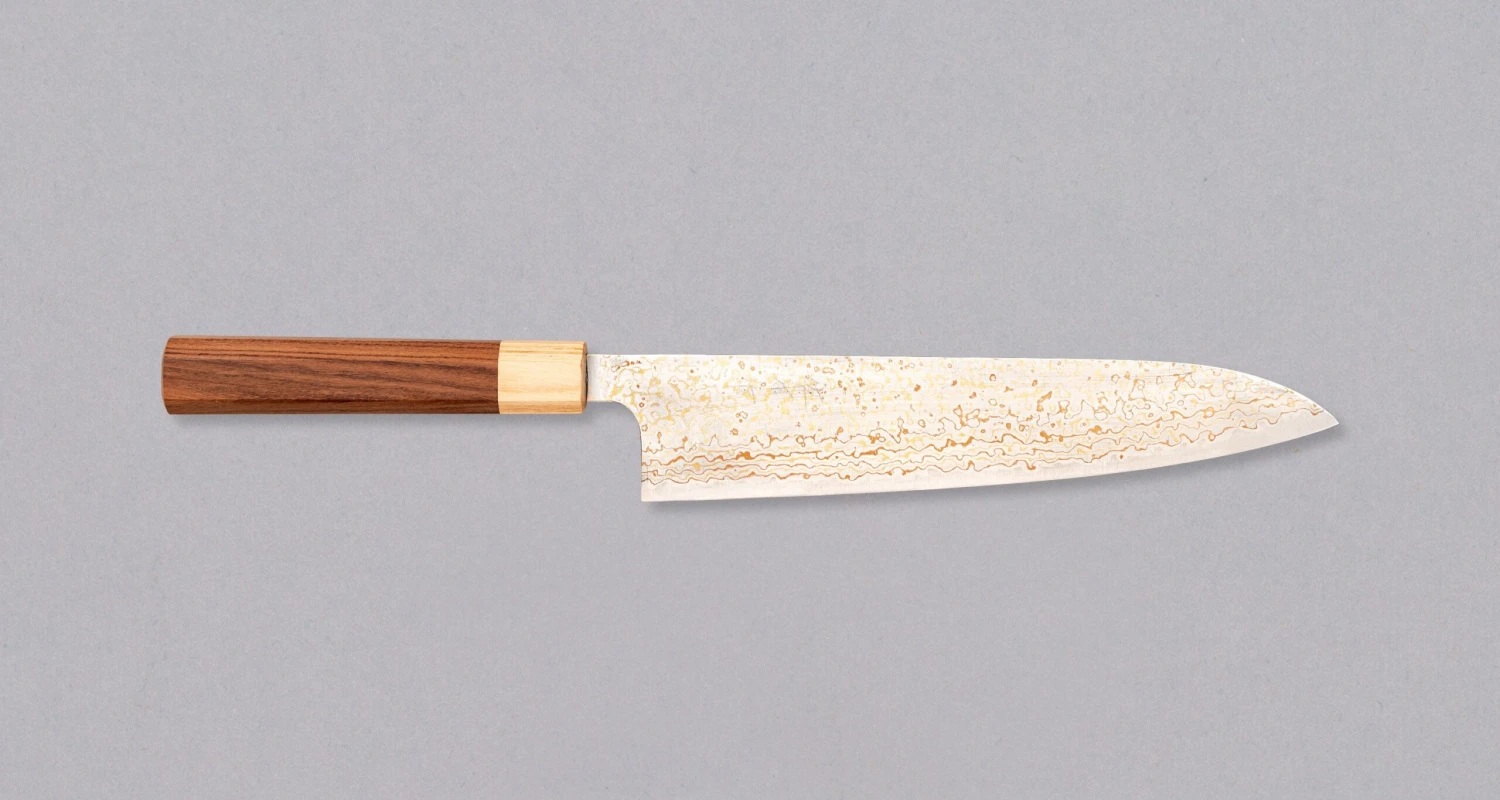 Gyuto is the most versatile and useful blade shape in the modern kitchen. It has a wide profile for easy food transfer and tends to be fairly flat towards the heel, enabling easy and fast chopping on the cutting board. A pointed tip allows piercing and precise, delicate work. A slight curve between the tip and the midsection makes the belly great for rocking the blade back and forth when cutting. It can be used for cutting meat, fish and vegetables.