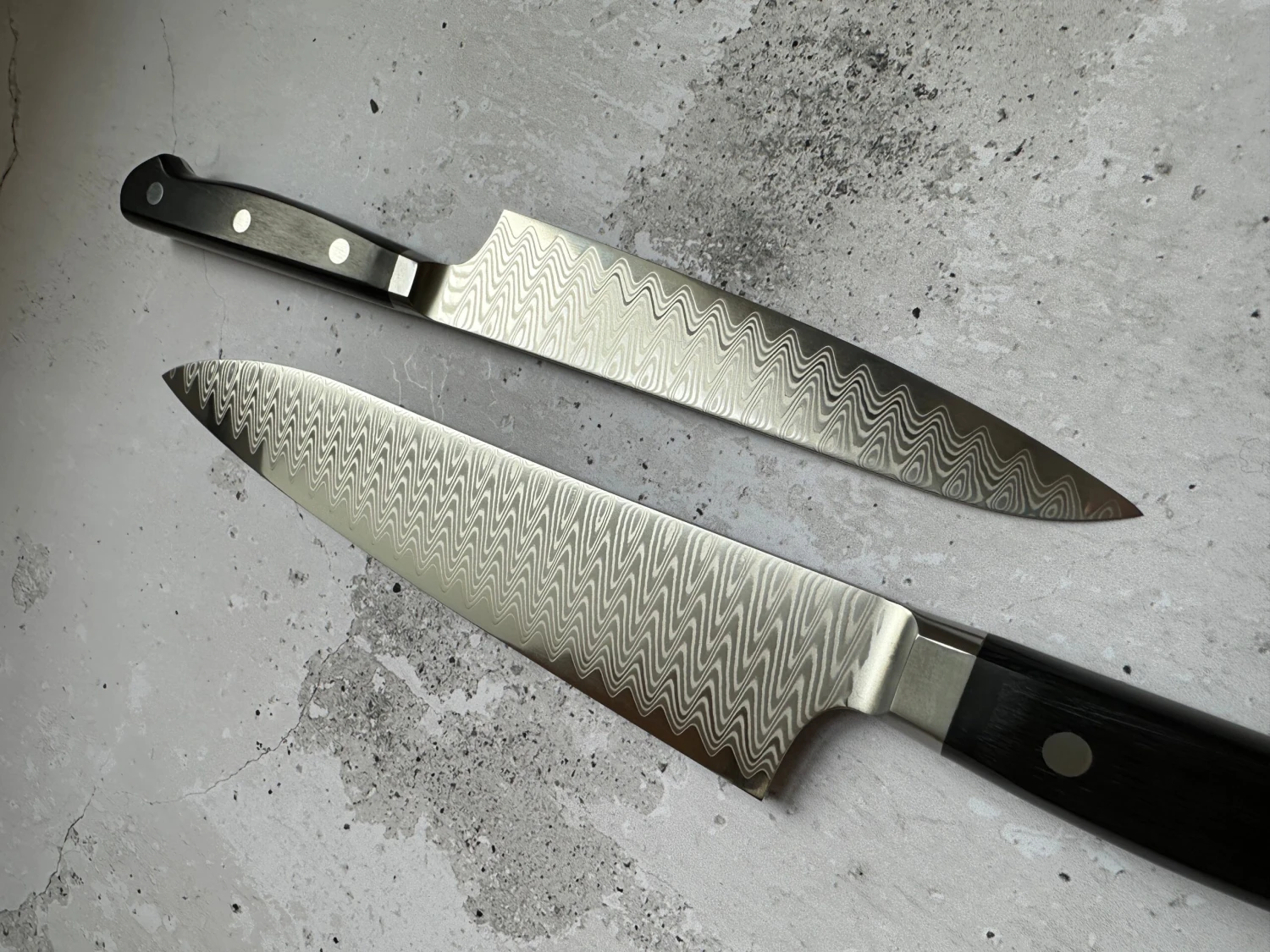 The core layer consisting of the hard HAP-40 steel was sandwiched between two sheets of softer damascus pattern steel. This technique is called san-mai and is used to protect the hard (but delicate) core from outside factors and physical impacts, which could lead to breakage.