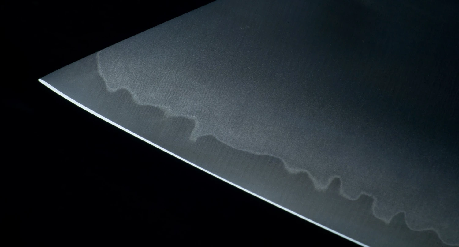 This bunka and petty feature a matte, unpolished finish with a very pronounced line at the bottom of the blade. This line indicates the border between the two softer, outer layers of steel, and the strong SG2 core steel, seen exposed at the very edge of the blade.
