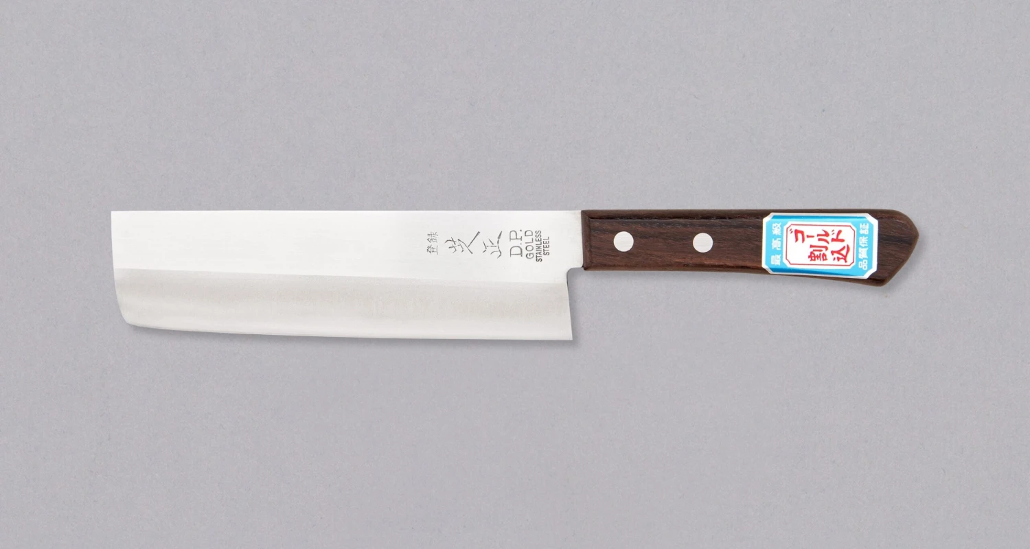 Shibamasa Nakiri VG-5 170mm is a great price-performer. It has every characteristic a Japanese knife should have. Stainless steel, kasumi finish, multi-purpose blade shape and a fine sharpness that will make quick work of any chopping task you throw at it.