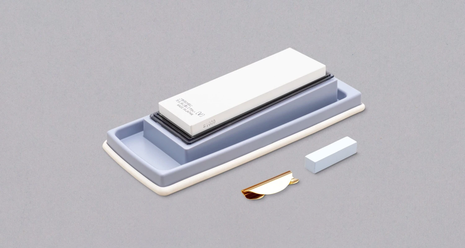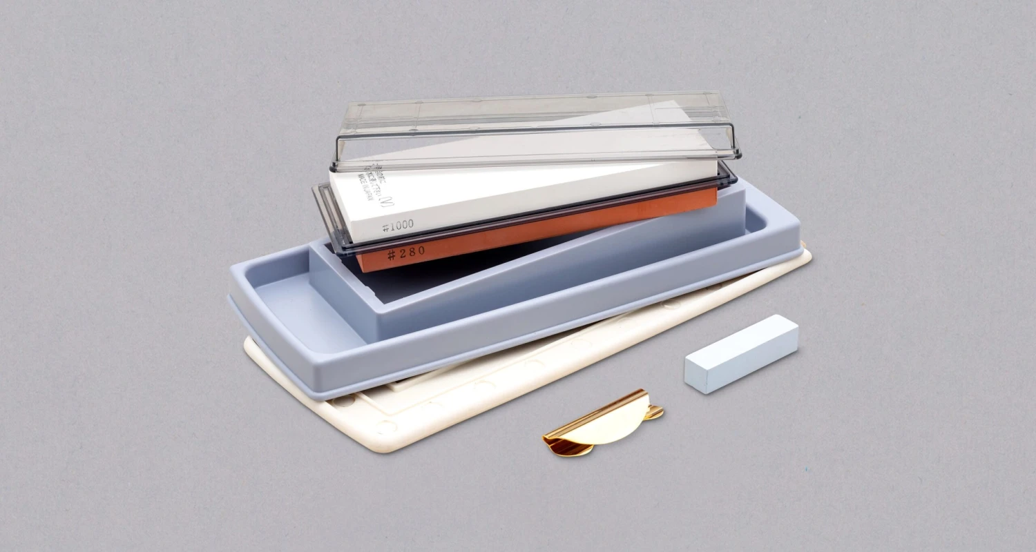 Introducing Suehiro’s SKG series – professional quality sharpening stones for your home kitchen. These softer stones quickly form a paste during sharpening, ensuring even and fast results. The set includes a combination whetstone (#280 and #1000 grit), a sharpening pad, and a stone base that doubles as a stand and water collector. Suitable for all types of steel (especially good for German knives)!