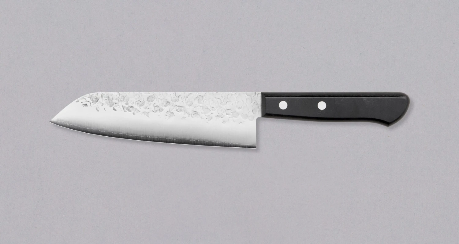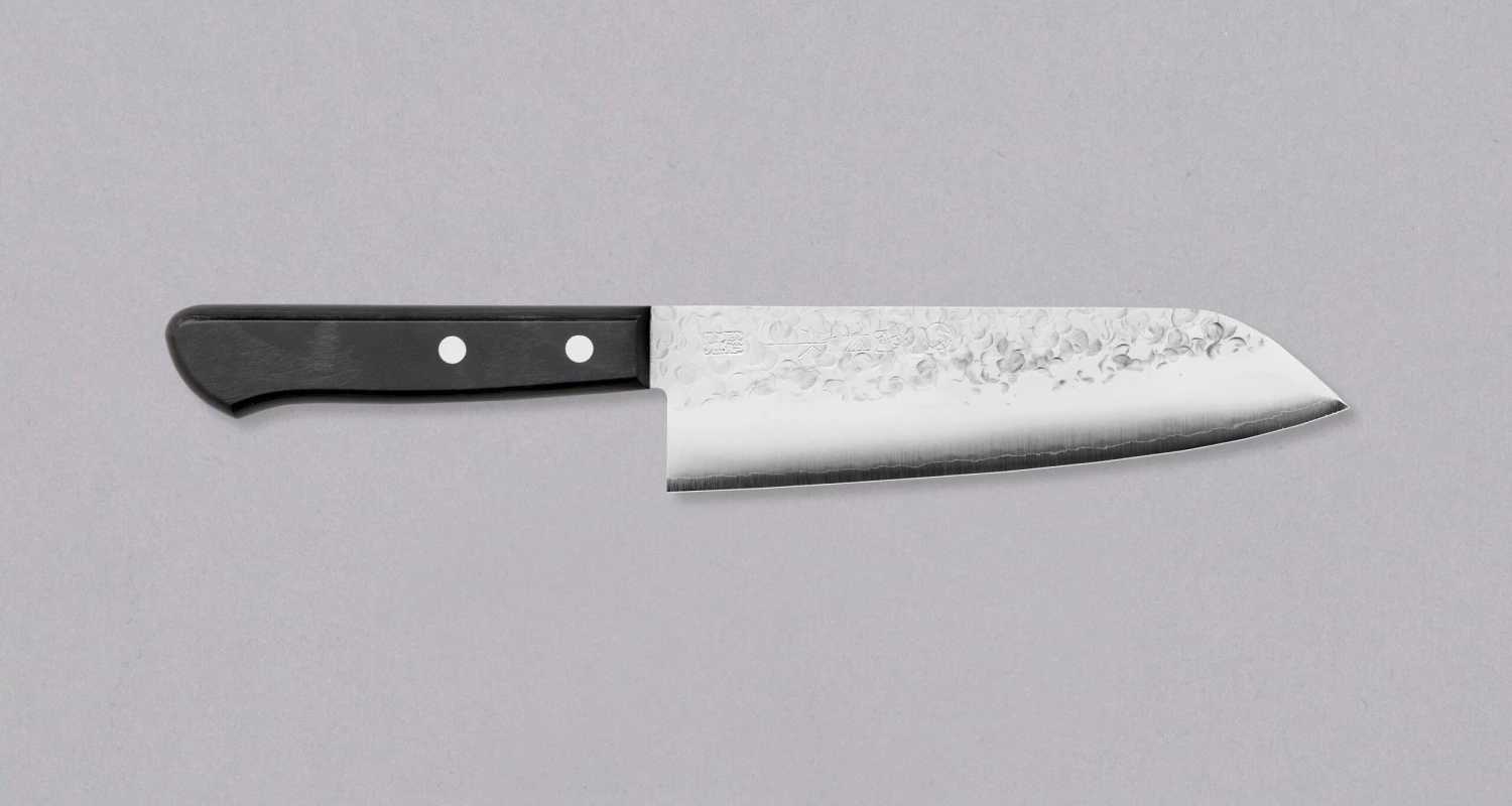 Takamura Santoku Chromax Tsuchime Black 170mm is a multi-purpose Japanese kitchen knife that won’t require you to break the bank. It’s the first knife that we offer made of Chromax steel, which is a new kitchen knife steel with some enviable attributes. It’s very hard (64 HRC), easy to sharpen and semi-stainless, which means it will resist corrosion better than traditional high-carbon Japanese knife steels. Together with a high-quality western (Yo) style pakka wood handle, this is a real performer made for anyone looking to get the maximum out of their knife.
