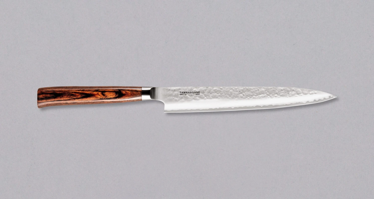 Tamahagane knives are made in the Tsubame-Sanjo region of Niigata prefecture in the North of Japan. The region is known for steel products that are made using traditional skills and knowledge blended with modern methods and technology. The smithy uses the name Tamahagane for this exceptional line of knives which boasts long-lasting sharpness and is an intricate blend of tradition, centuries worth of experience and the advancement of modern metallurgy.