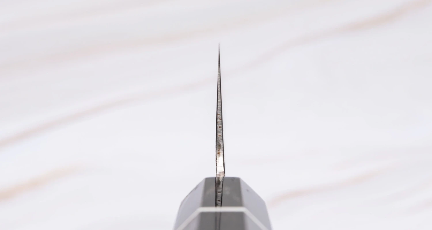 The double bevel blade, featuring a hamagri grind (for explanation, read the Blade Construction: Geometry article) measures 240mm (9.4″) in length and should work for chefs and experienced home cooks alike.