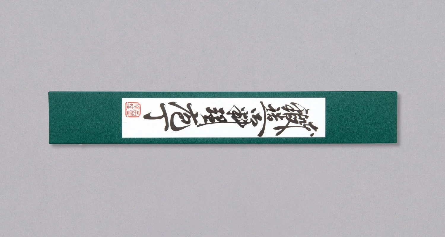 The knife’s aesthetic continues in a gray monochrome palette, the sole distinct characteristic of the blade being a striking hand-chiseled kanji.