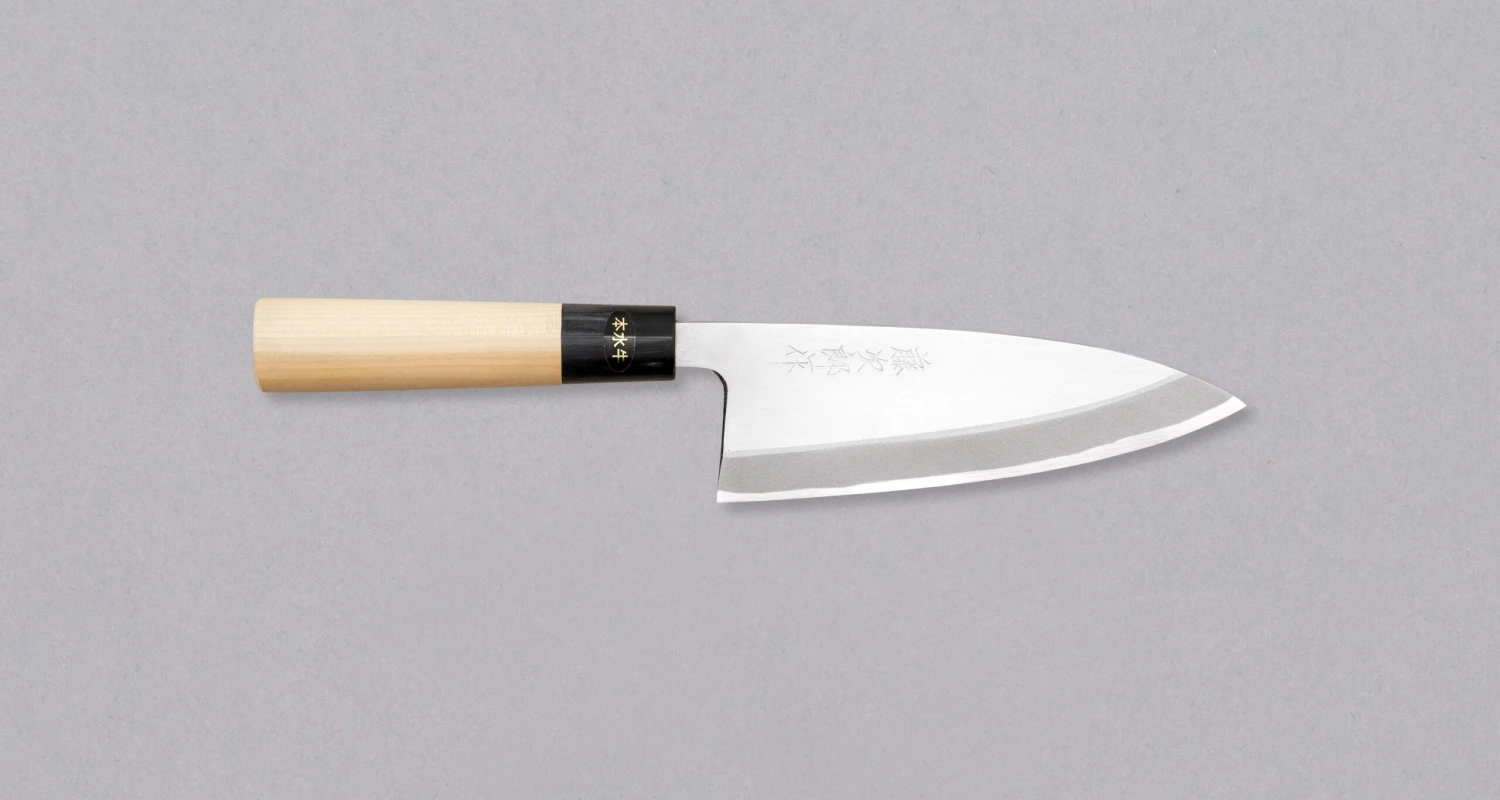 The deba knife shape is one of the »big three« Japanese traditional kitchen knives, alongside usuba and yanagiba. They are essentials that every sushi chef needs to master. Deba is a traditional knife a chef uses to prepare the whole fish: anything from cleaning, filleting, portioning fish, removing fins and heads, to chopping through small bones. It can also be used for preparing poultry and other meat with small bones. You can read more about deba knives in this article.