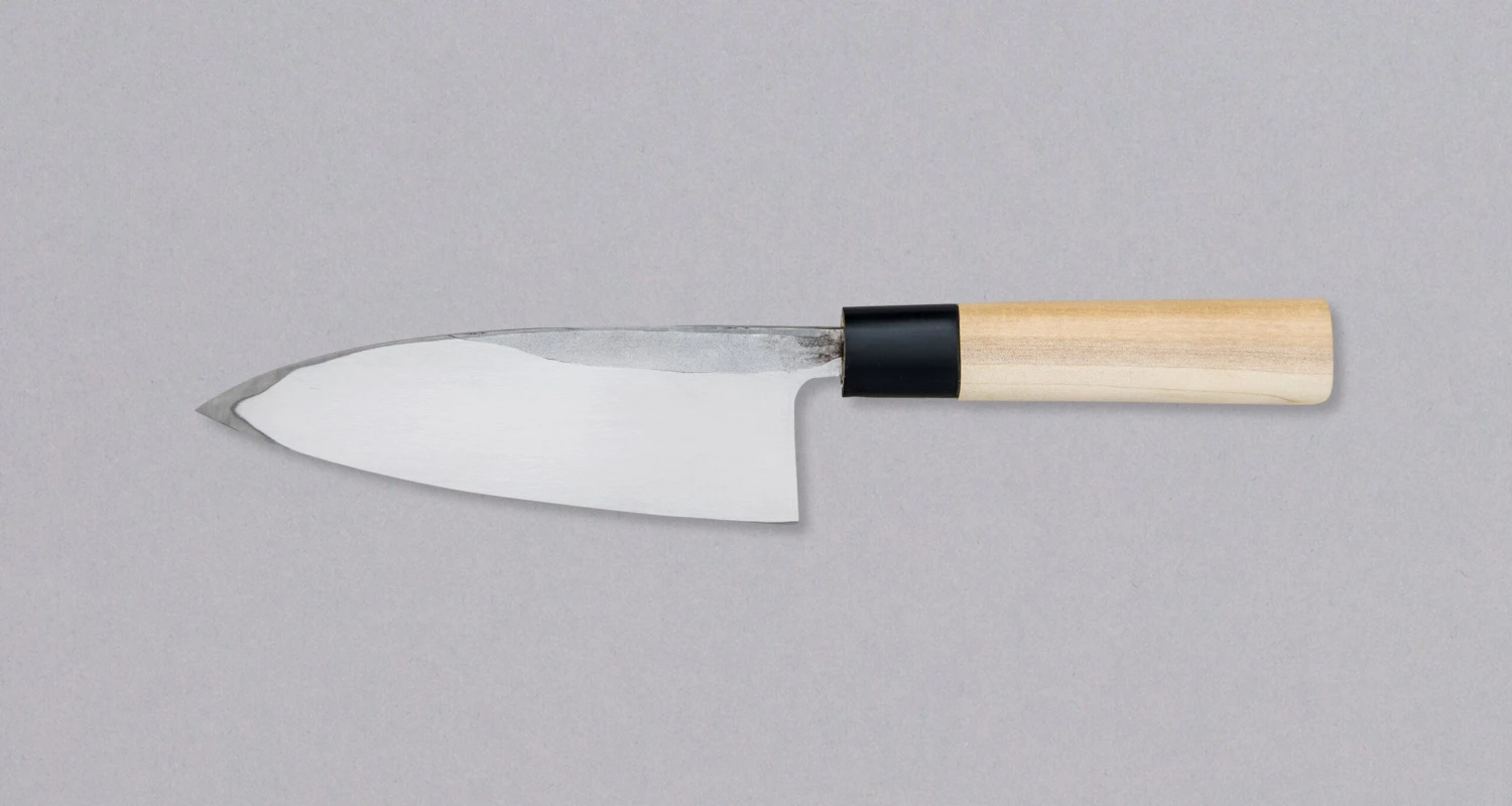 TOJIRO Deba Shirogami is a medium-sized deba designed fish lovers and professional chefs. The blade thickness is at hefty 7mm (0.28″), the blade length is 165mm (6.5″), so it is suitable for filleting medium-sized fish. The D-shaped handle is made from traditional magnolia wood with a resin ferrule.