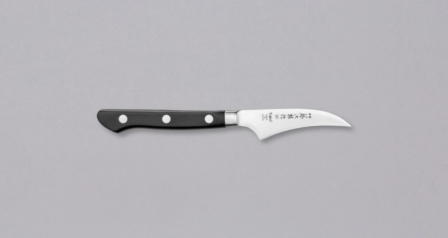 TOJIRO Bird’s Beak Paring knife is mostly used in a professional kitchen for peeling or carving fruits and vegetables and is especially essential to tourne vegetables (a French staple technique). It will come in handy in a home kitchen too, especially with peeling spherical fruits and veggies, although the standard shaped paring/petty knife should also do the trick.