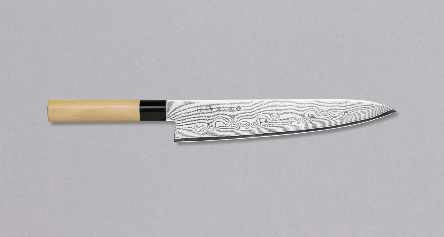 TOJIRO Gyuto Damascus in 270mm (10.6″) blade length is for those chefs and home cooks that are not afraid of using large knives. Larger knife means more real-estate, so it will stay sharp longer simply because there is more edge to utilize. Longer blade also helps us with slicing larger pieces of meat and fish. We only recommend a knife this size to users with a large workspace and a big cutting board.