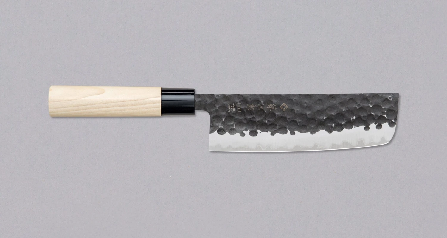 TOJIRO Nakiri DP Hammered 170mm (6.7″) is a new budget superstar from the hands TOJIRO’s blacksmiths. TOJIRO’s secret recipe of hardening VG-10 steel doesn’t disappoint with their new line of hammered kuro-uchi knives either. The knife is very sharp out-of-the-box and is ready to make some (precise) damage to the all the veggies you’re about to prepare. Nakiri blade shape is a traditional Japanese knife shape, designed for the task of cutting vegetables. A knife that will be appreciated in the hands of a prep cook with mountains of veggies to prepare every day. Recently, many nakiris find their way into home kitchens – it’s a perfect knife for vegetarians and veggie lovers. Chop away!