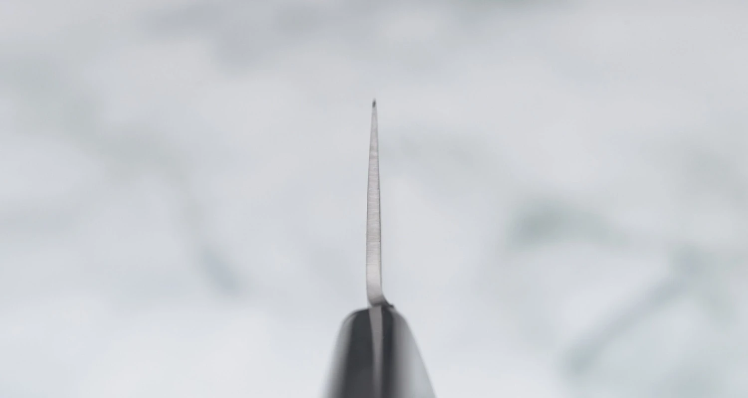 The blade features a clean, highly polished mirror finish (also called migaki). It is a simple, minimalistic blade. The surface of the knife is thinned and polished during the manufacturing process to expose the smooth and shiny surface of the knife. Such a finished look minimizes damage to the food cells during cutting, so it is suitable for the most delicate tasks.