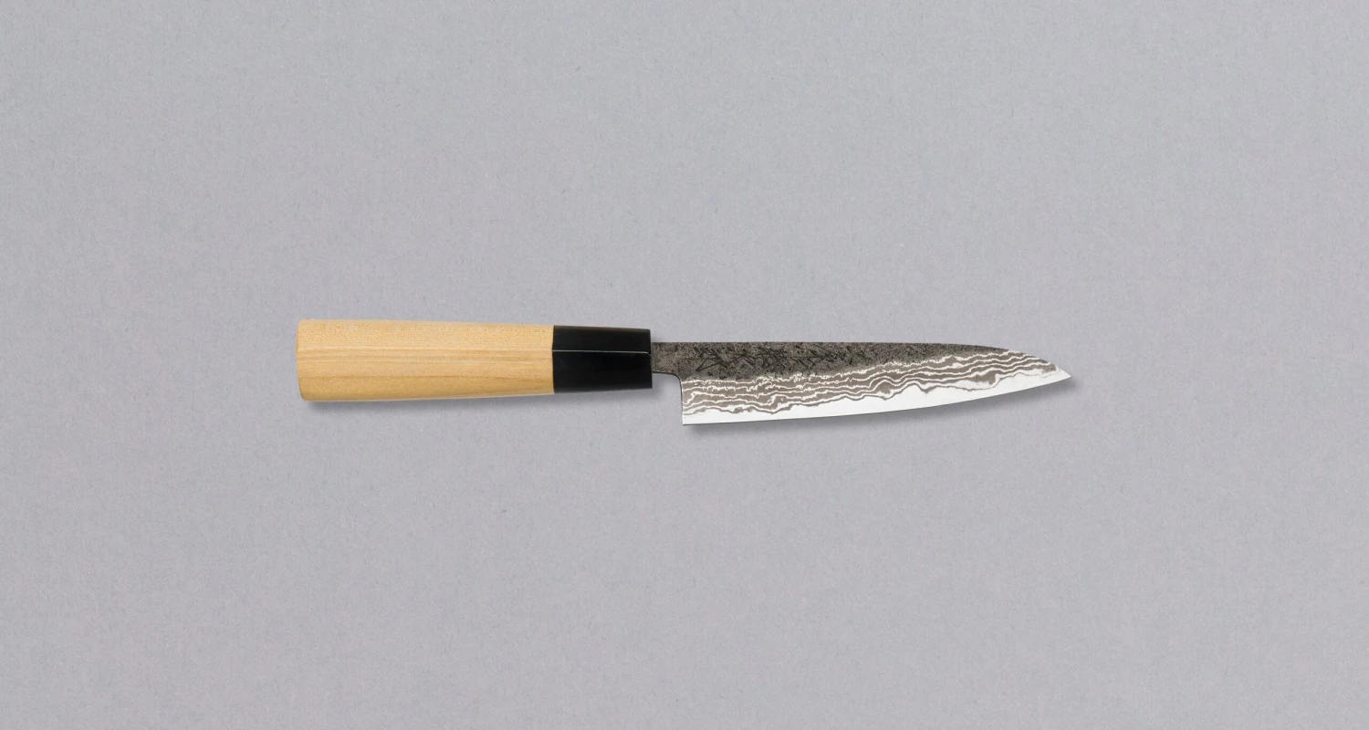 This hand-forged petty presents the top level of TOJIRO’s offer of multi-purpose, small kitchen knives. The excellent Aogami #2 core is hand-forged using the traditional method into a beautiful 21-layer Damascus pattern with black kuro-uchi patina.