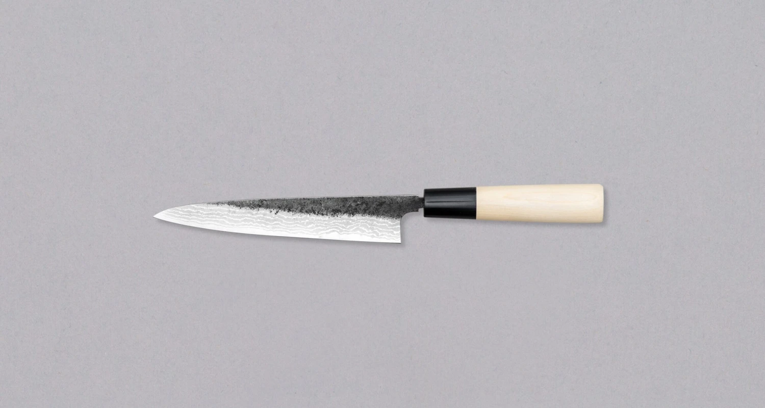 This hand-forged petty presents the top level of TOJIRO’s offer of multi-purpose, small kitchen knives. The excellent Aogami #2 core is hand-forged using the traditional method into a beautiful 21-layer Damascus pattern with black kuro-uchi patina.