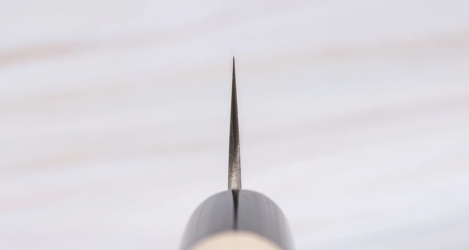 The core of the knife is Aogami #2 steel (one of the most regarded high-carbon steels), clad in two layers of softer layers of steel (called san-mai clad). This is a great combination of two different types of steel – the outer layers will protect the blade from chipping by making it tougher and more flexible, and at the same time, we have top-notch steel for the cutting edge. Advantages of Aogami #2 steel are a very fine, gentle sharpness, it is easy to sharpen, and remains sharp for a long time. The lower part of the blade where the Aogami #2 steel is exposed will develop some patina after time, so we recommend oiling the blade regularly in order to prevent the development of rust. Read more about how to take care of high carbon knives and patina in our Knife maintenance blog post.