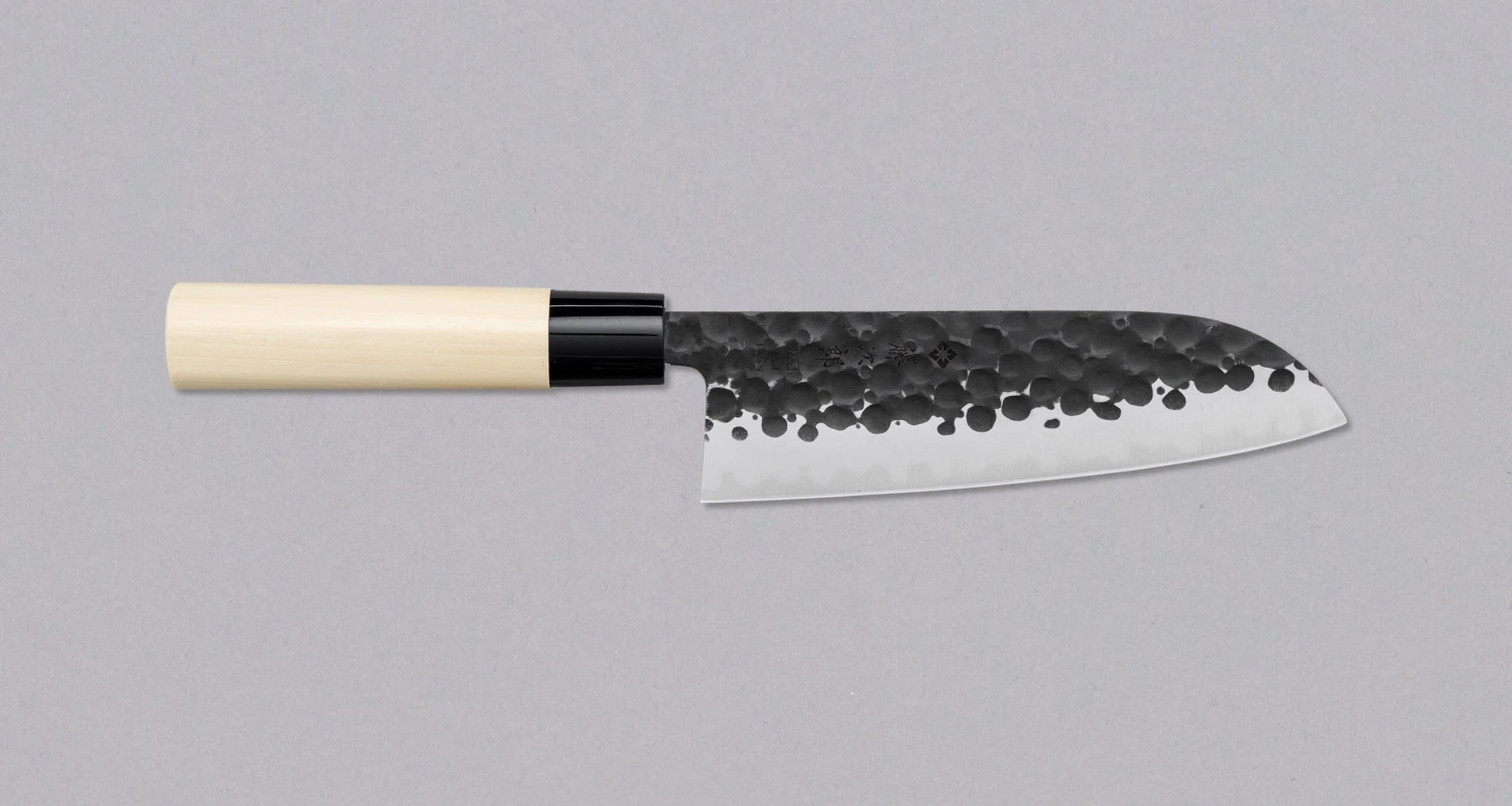 TOJIRO Santoku DP Hammered 170mm (6.7″) is a new budget superstar from the hands TOJIRO’s blacksmiths. TOJIRO’s secret recipe of hardening VG-10 steel doesn’t disappoint with their new line of hammered kuro-uchi knives either. The knife is very sharp out-of-the-box and is ready to make some (precise) damage to the food you’re about to prepare. The santoku shape is the most popular knife shape in Japanese home kitchens, so have no doubts it work well as a multi-purpose knife in your kitchen too. Dicing, slicing and mincing are the preferred moves with santoku knives. With the 170mm blade length, you will only miss a couple of centimeters when cutting larger pieces of meat.