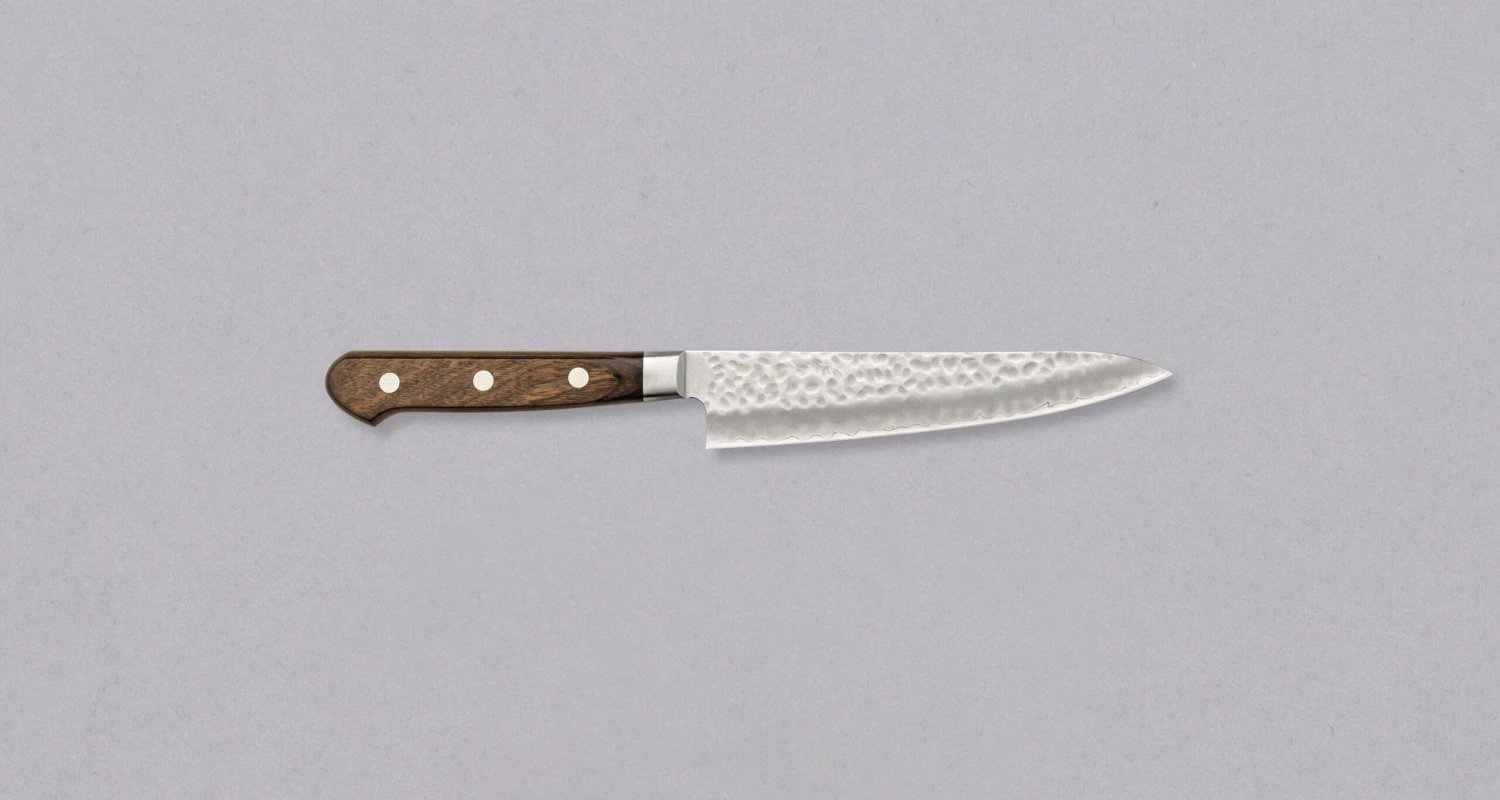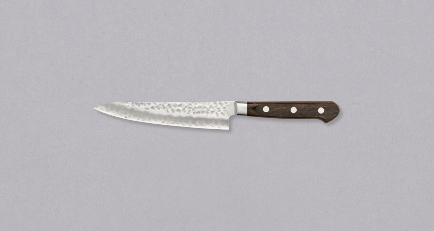 Tsunehisa AUS-8 Tsuchime Petty is a small multi-purpose Japanese kitchen knife that can be used for peeling, mincing, paring and decorating food. Unique tsuchime blade finish, stainless steel, and a lightweight Western style handle made of pakka wood (known for its durability and comfortable grip), low maintenance and a price you don’t have to break the bank to buy one makes this petty a real bargain.Â