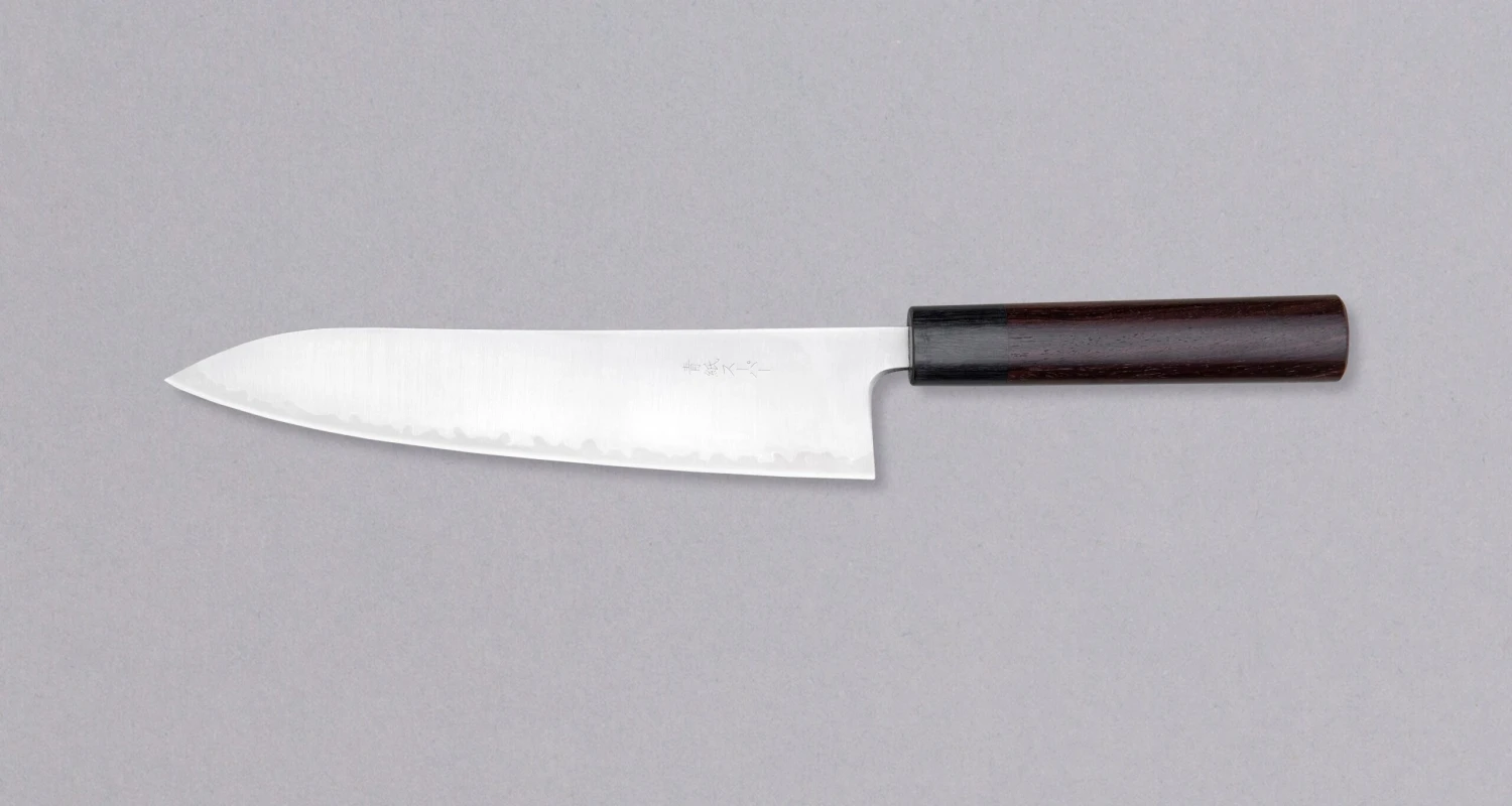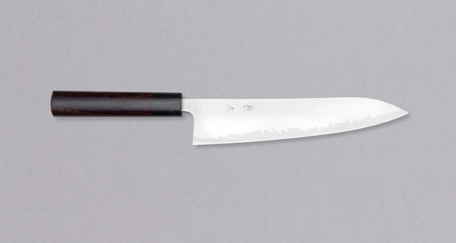 Gyuto is the most versatile and useful blade shape in the modern kitchen. It has a wide profile for easy food transfer and tends to be fairly flat towards the heel, enabling easy and fast chopping on the cutting board. A pointed tip allows piercing and precise, delicate work. A slight curve between the tip and the midsection makes the belly great for rocking the blade back and forth when cutting. It can be used for cutting meat, fish and vegetables.