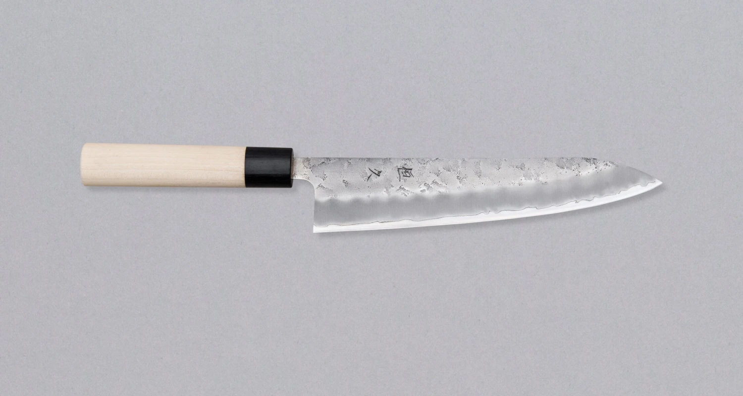 Gyuto is the most versatile and useful blade shape in the modern kitchen. It has a wide profile with an extra height clearance for easy food transfer and tends to be fairly flat towards the heel, enabling easy and fast chopping on the cutting board. A pointed tip allows piercing and precise, delicate work.
